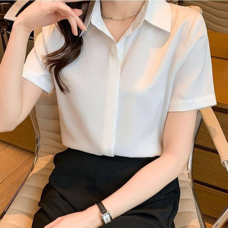 여름 얇은 시폰 반팔 화이트 셔츠 여성 디자인 틈새 톱 2025 새로운 전문 블랙 우아한 셔츠스토어 가기