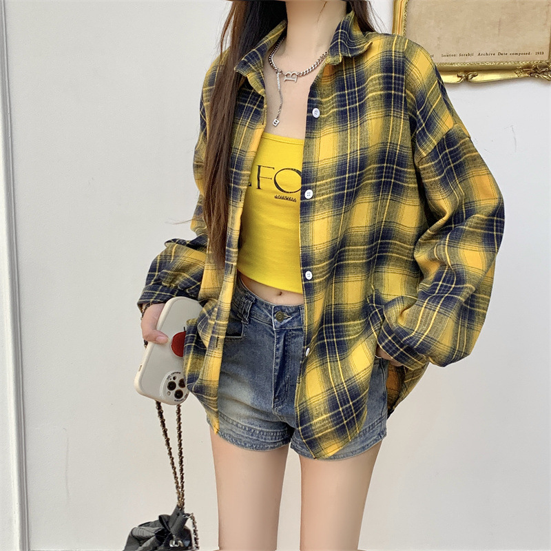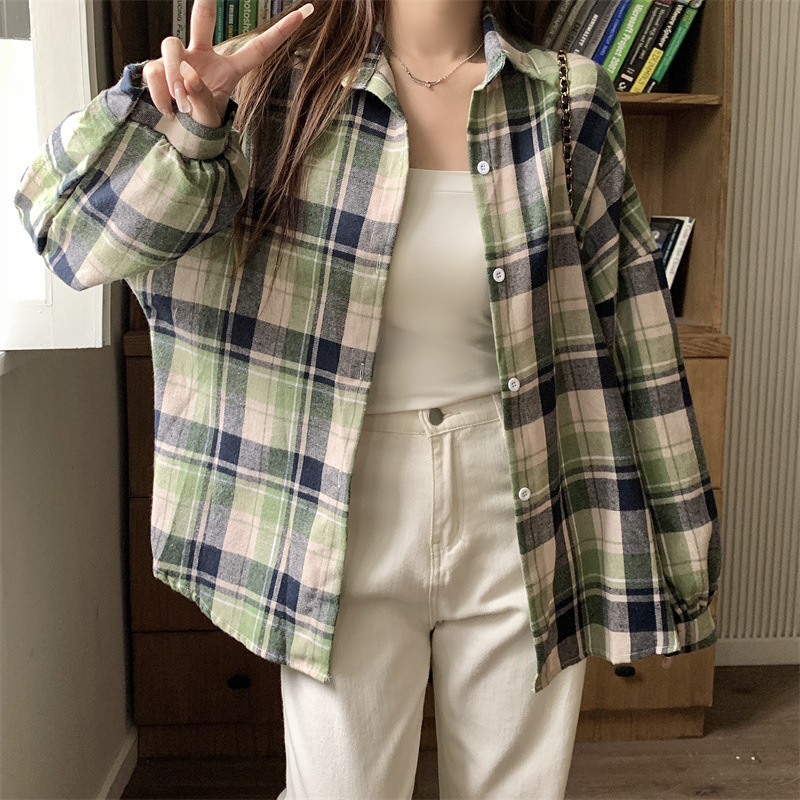 한국의 하이 엔드 디자인 감각 틈새 셔츠 여성 봄 빈티지 홍콩 풍미 조커 느슨한 체크 무늬 셔츠 코트 도매스토어 가기