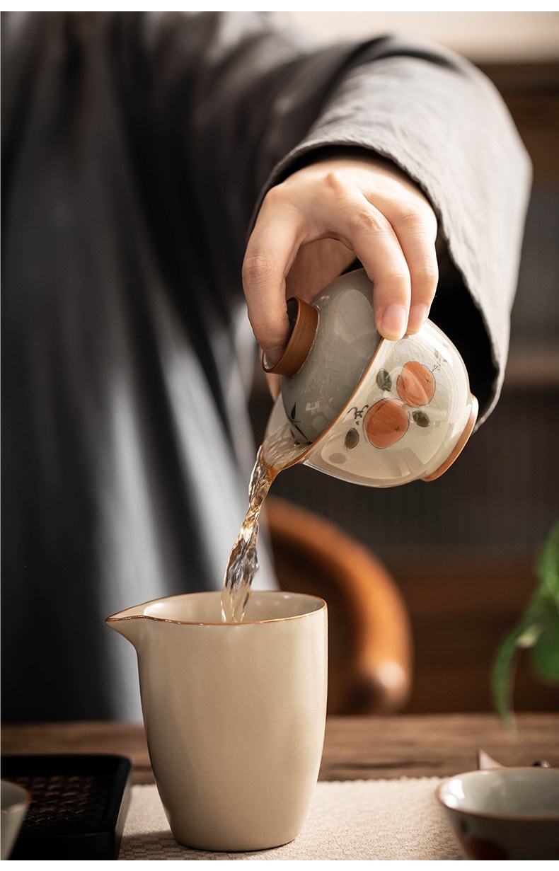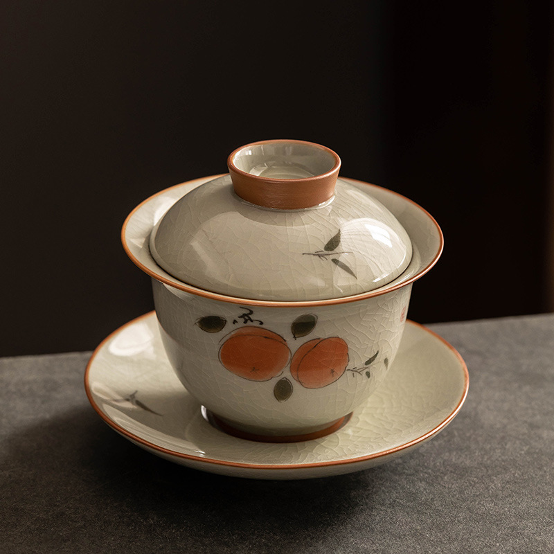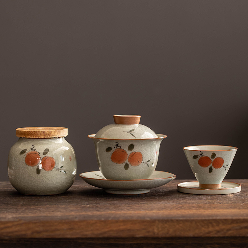 • "게가마 손으로 그린 ""감"" 삼채 덮은 그릇 + 차캔 + 코스터 + 찻잔"