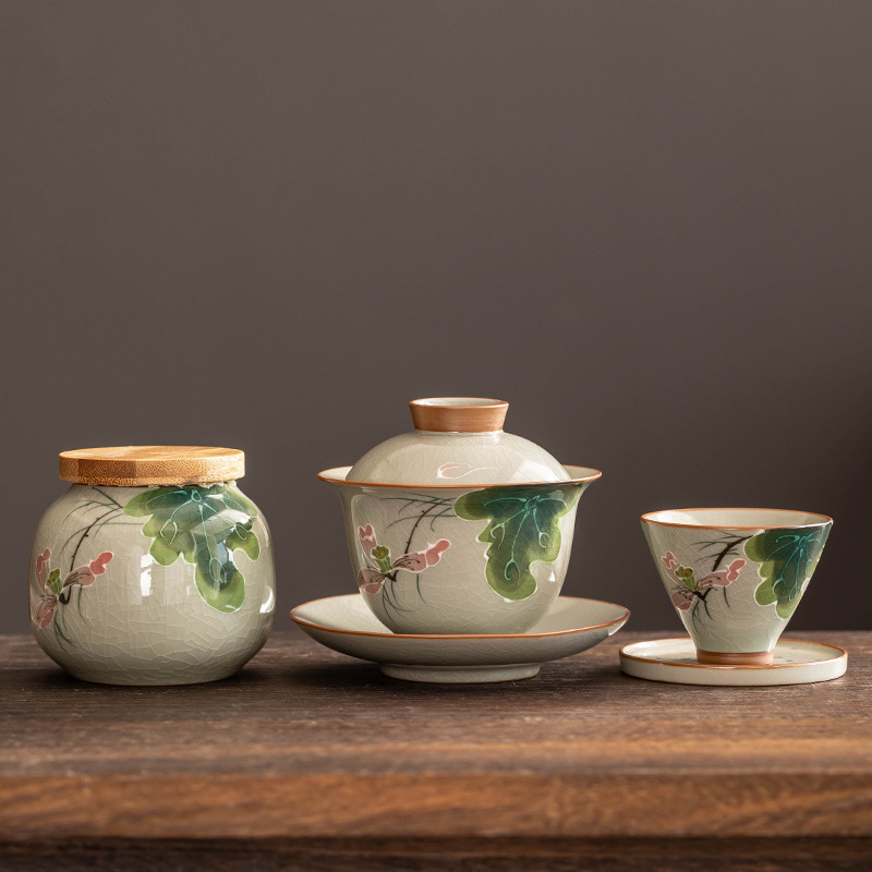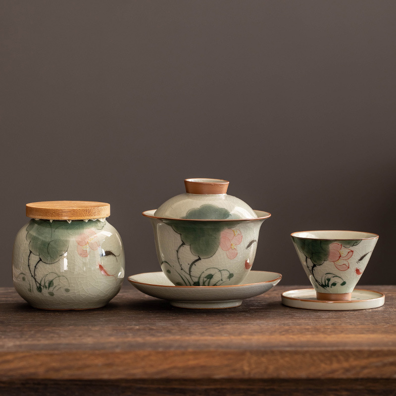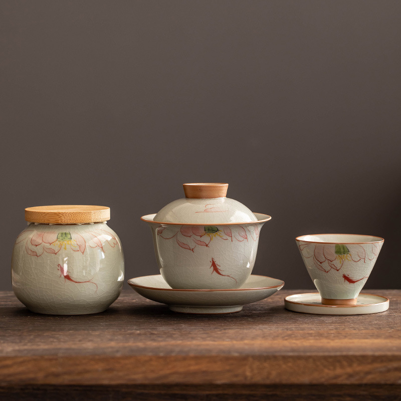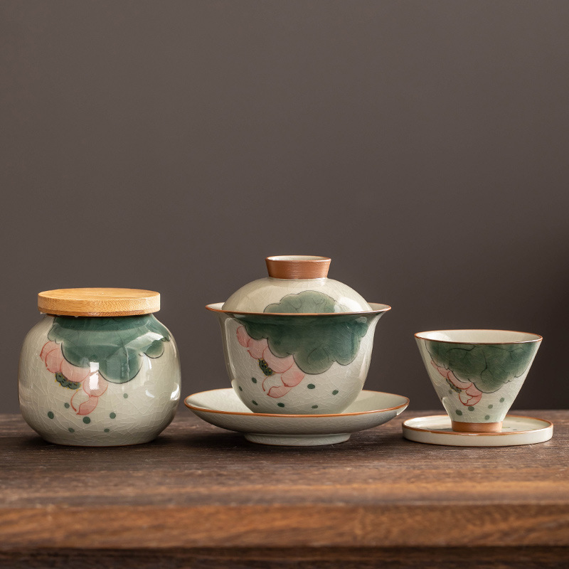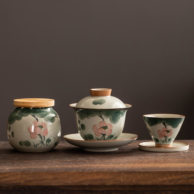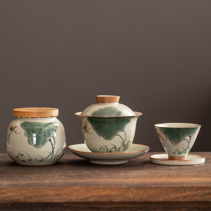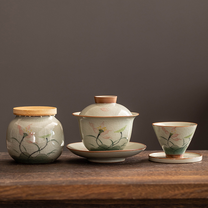 • "Ge Kiln 손으로 그린 ""연꽃"" 삼채 덮은 그릇 + 차 캔 + 코스터 + 찻잔"