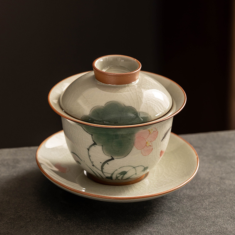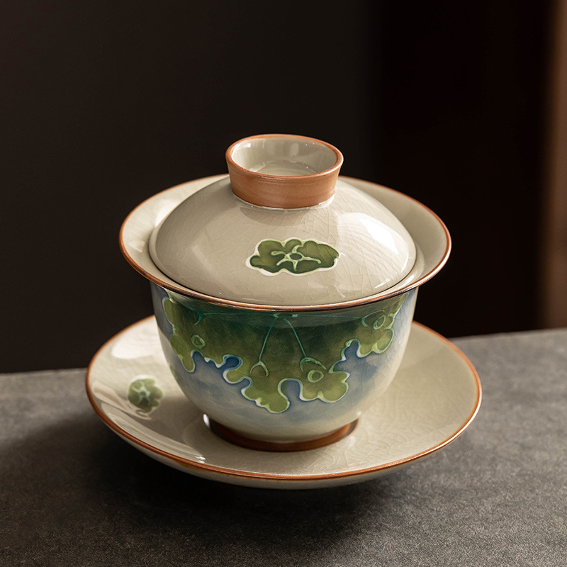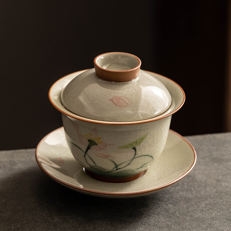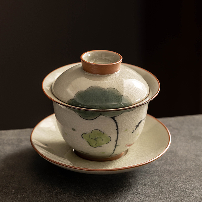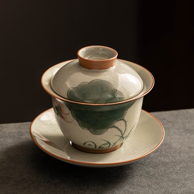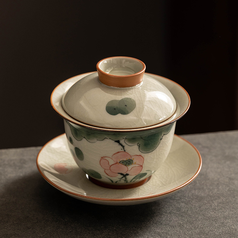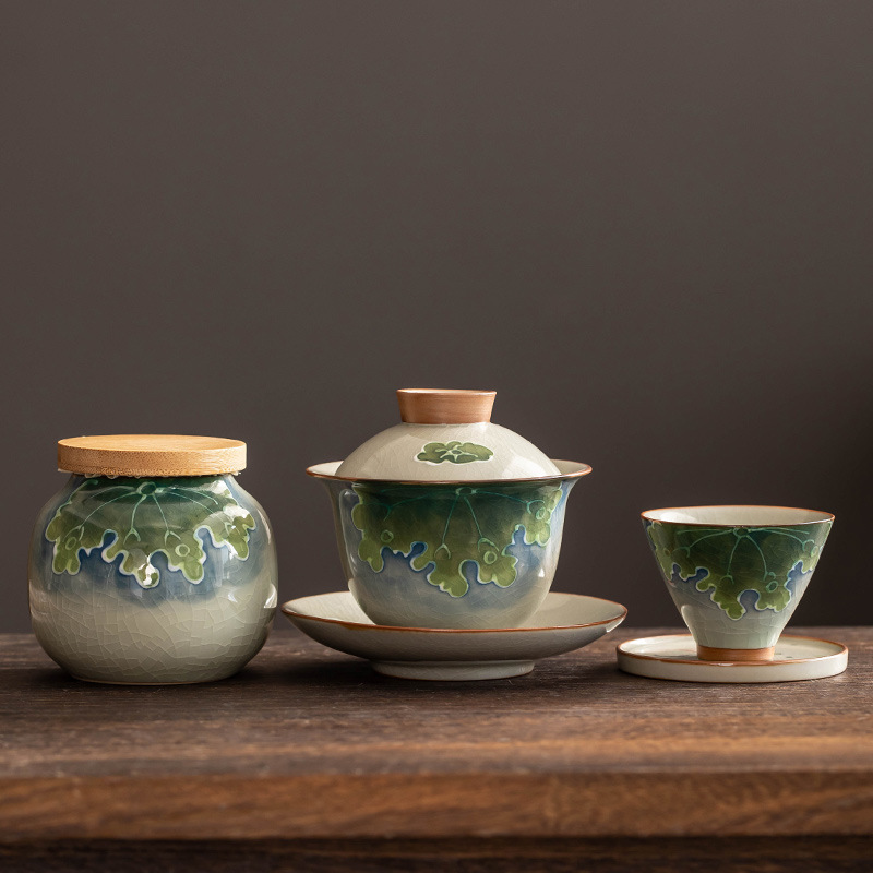 • "Ge Kiln 손으로 그린 ""연꽃"" 삼채 덮은 그릇 + 차 캔 + 코스터 + 찻잔"