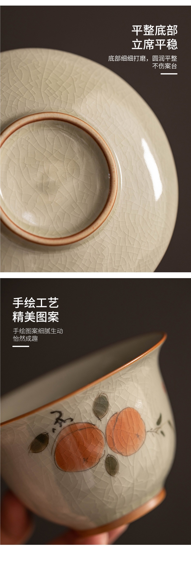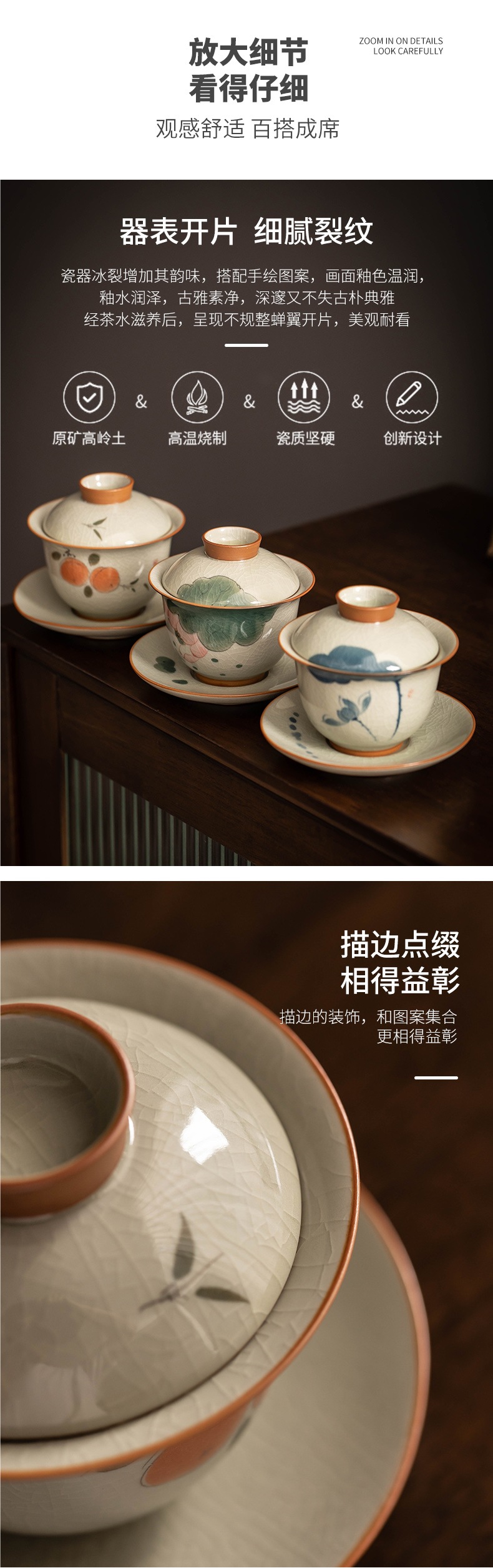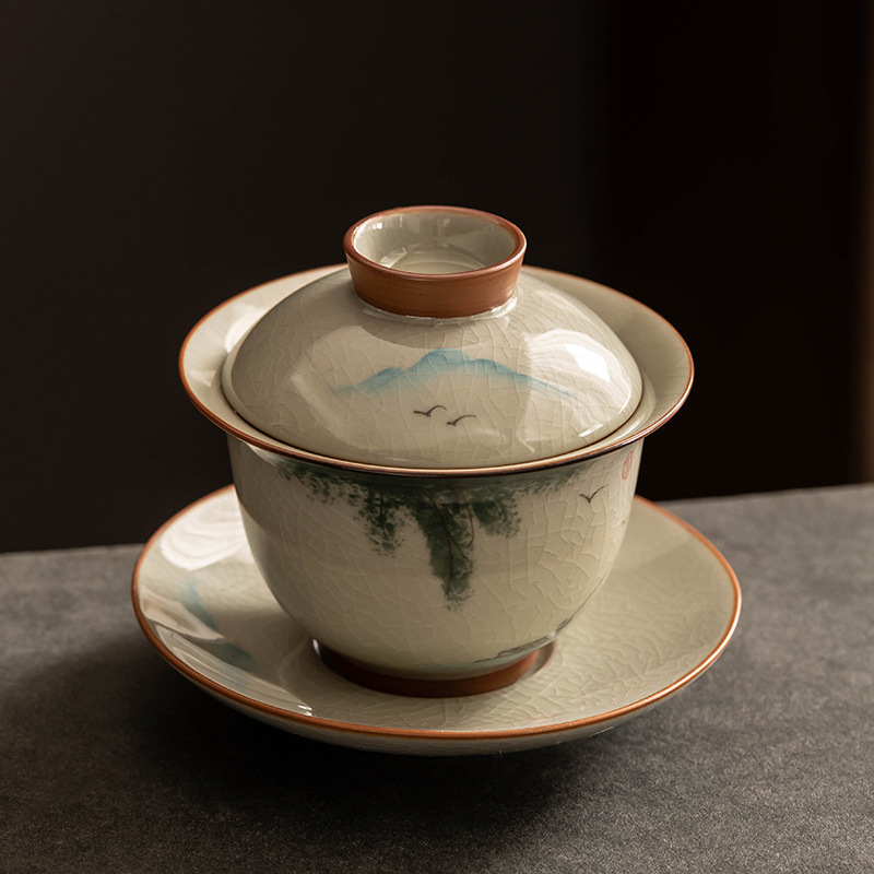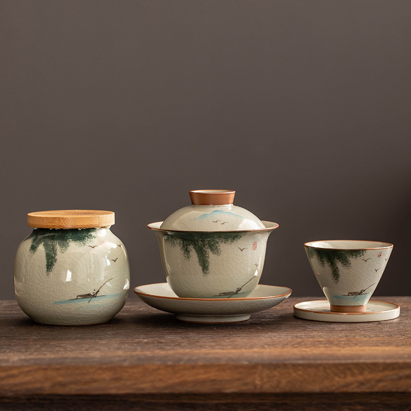 • "Ge Kiln 손으로 그린 ""Yuhe"" 삼재 덮은 그릇 + 차 캔 + 코스터 + 찻잔"