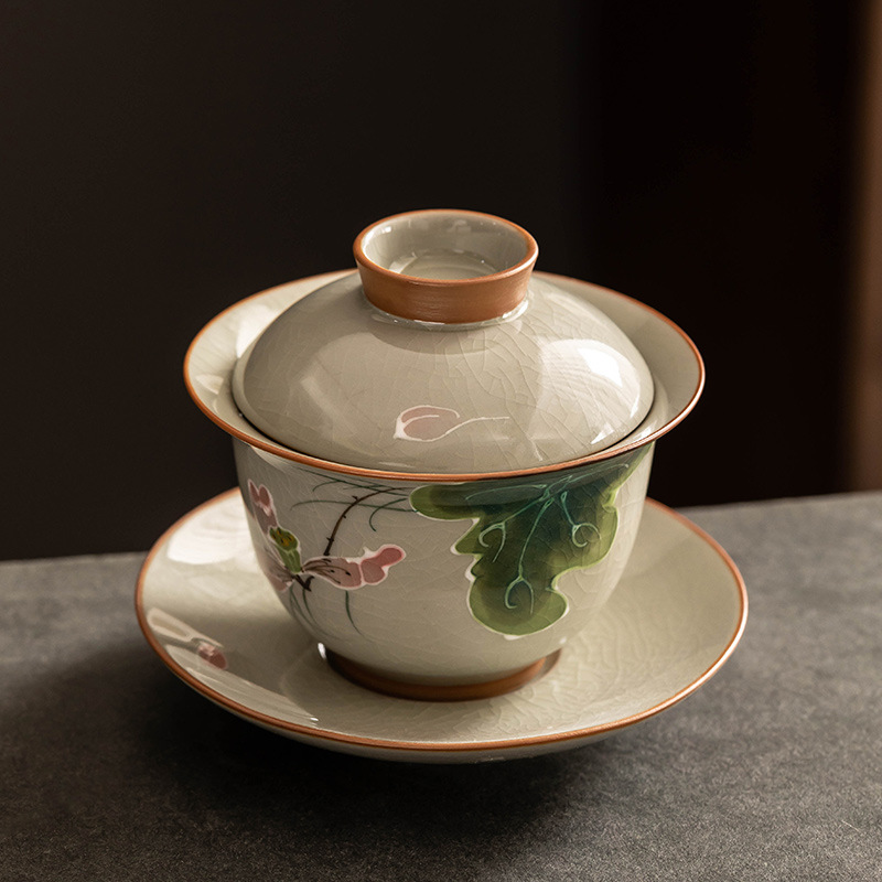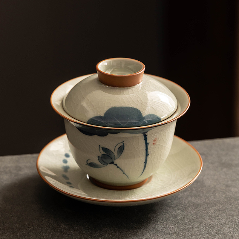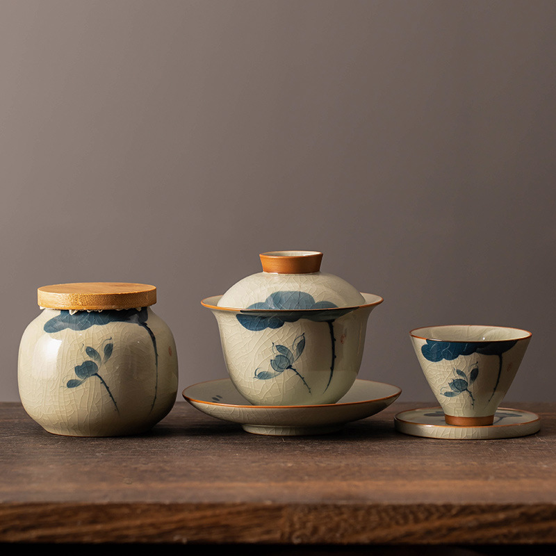 • "Ge Kiln 손으로 그린 ""꽃봉오리"" 삼재 덮은 그릇 + 차 캔 + 코스터 + 찻잔"