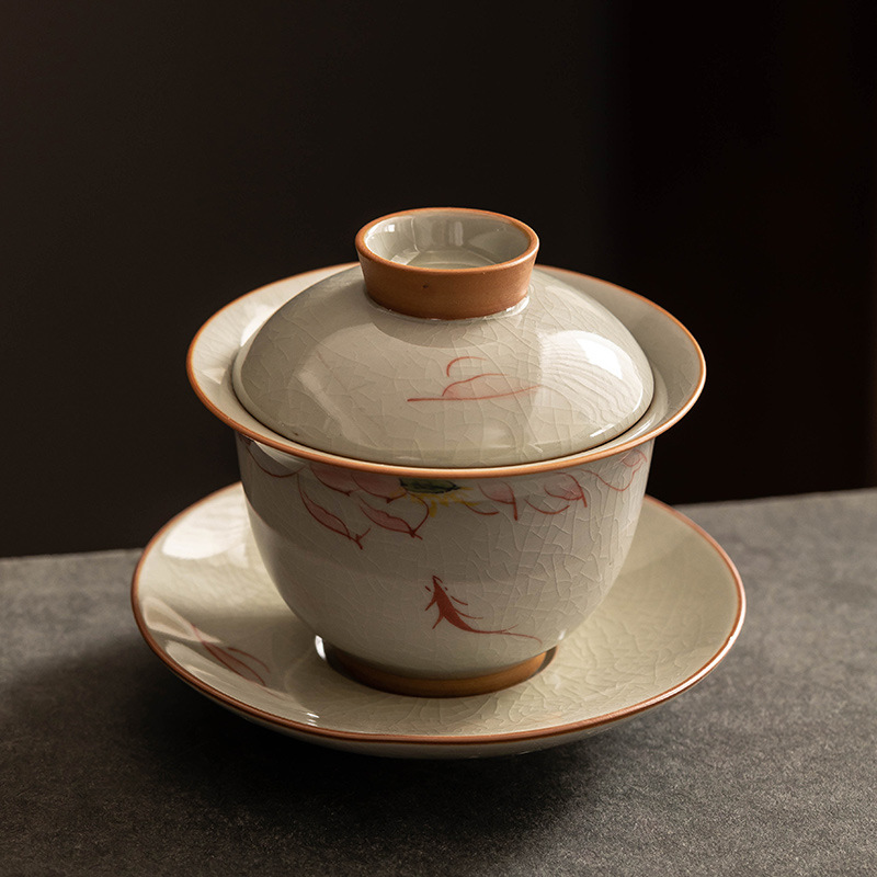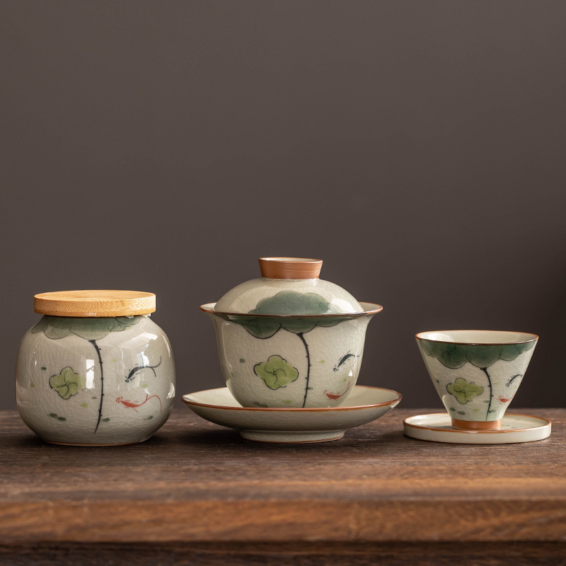 • "Ge Kiln 손으로 그린 ""물고기 놀이"" 삼재 덮은 그릇 + 차 캔 + 코스터 + 찻잔"