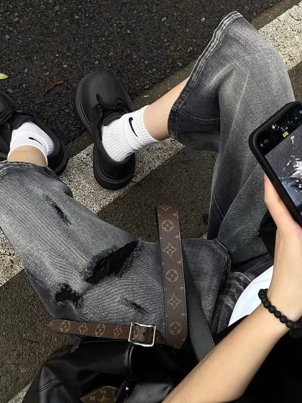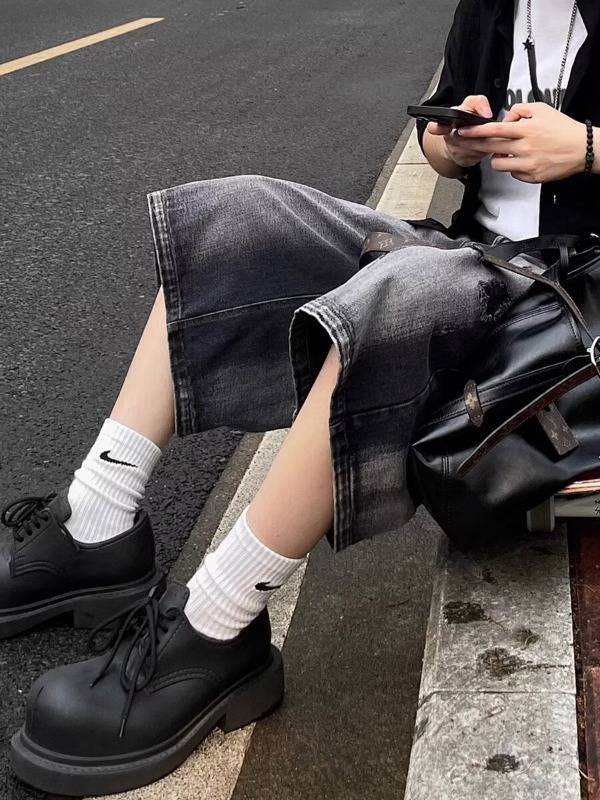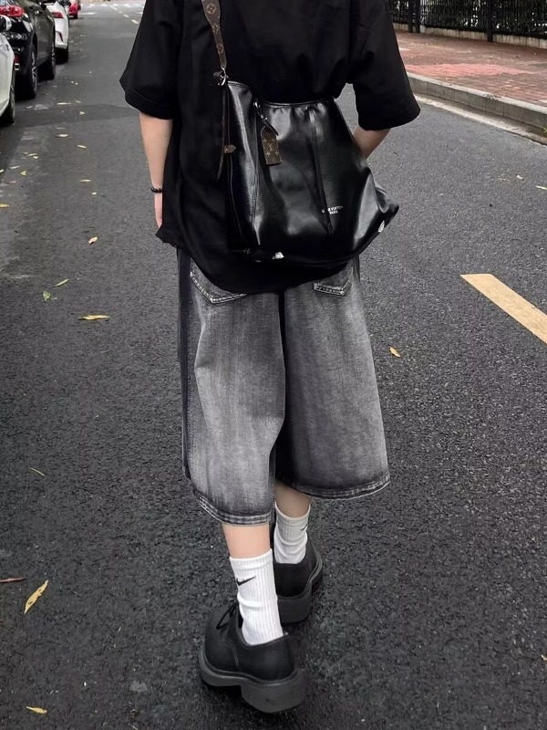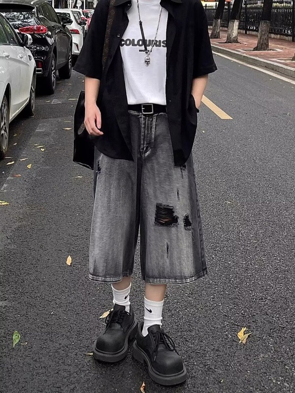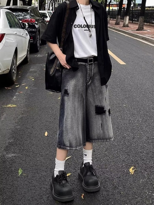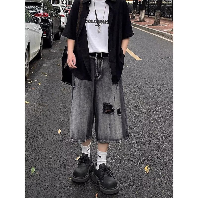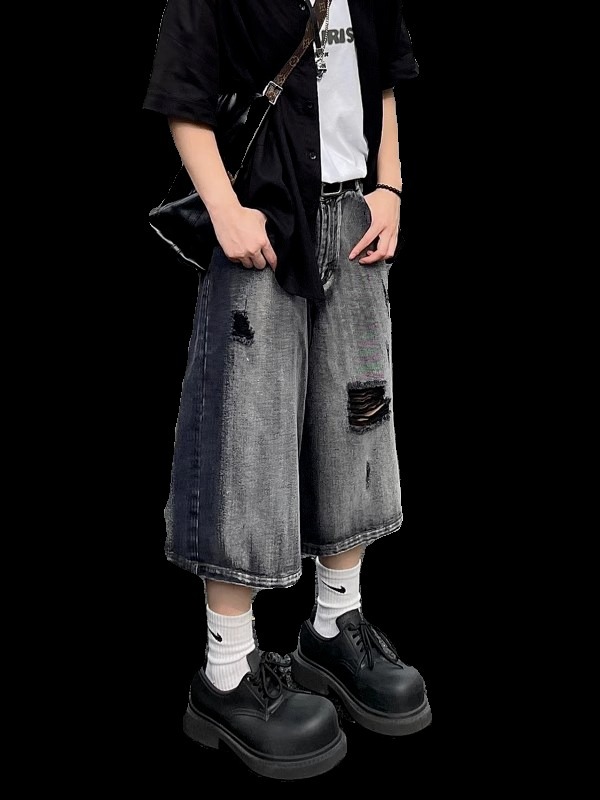유럽과 미국의 Hiphop 바지 여름 새로운 하이 스트리트 힙합 데님 반바지 느슨한 스트레이트 리핑 디자인 센스 바지스토어 가기