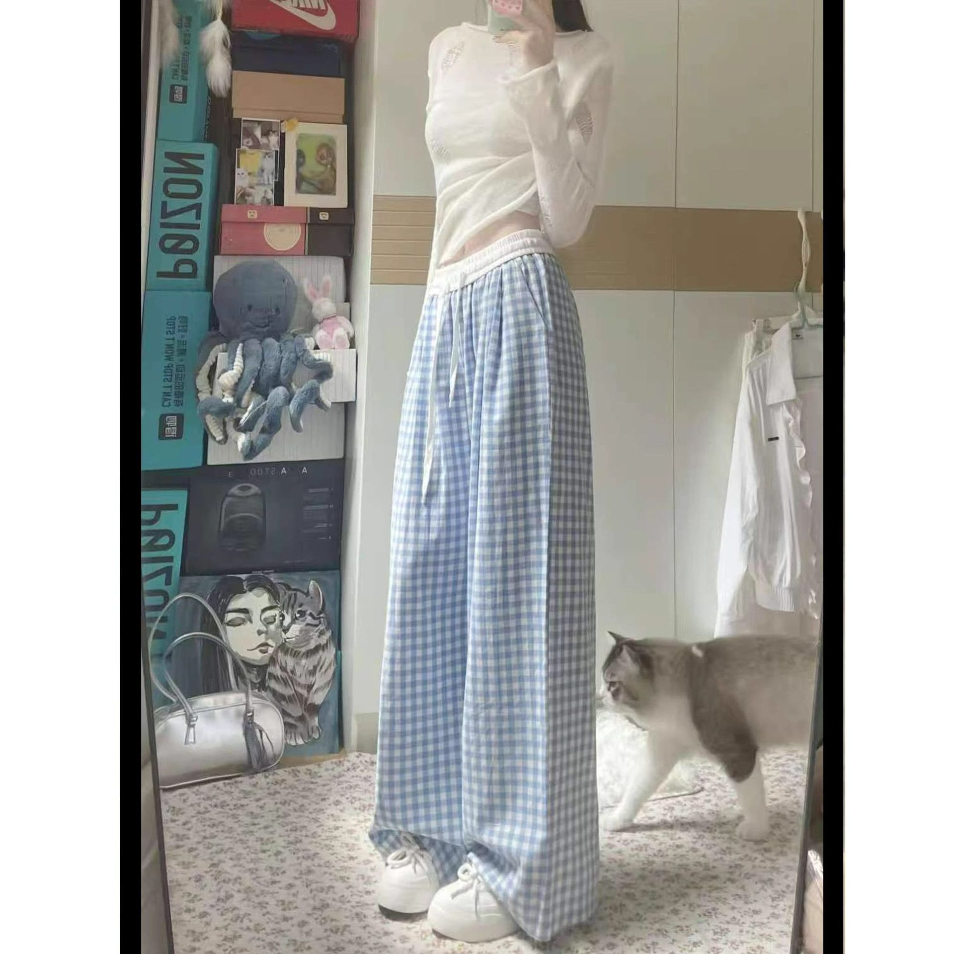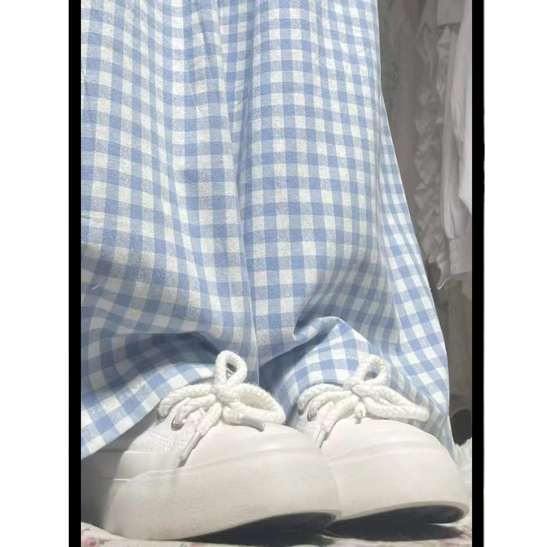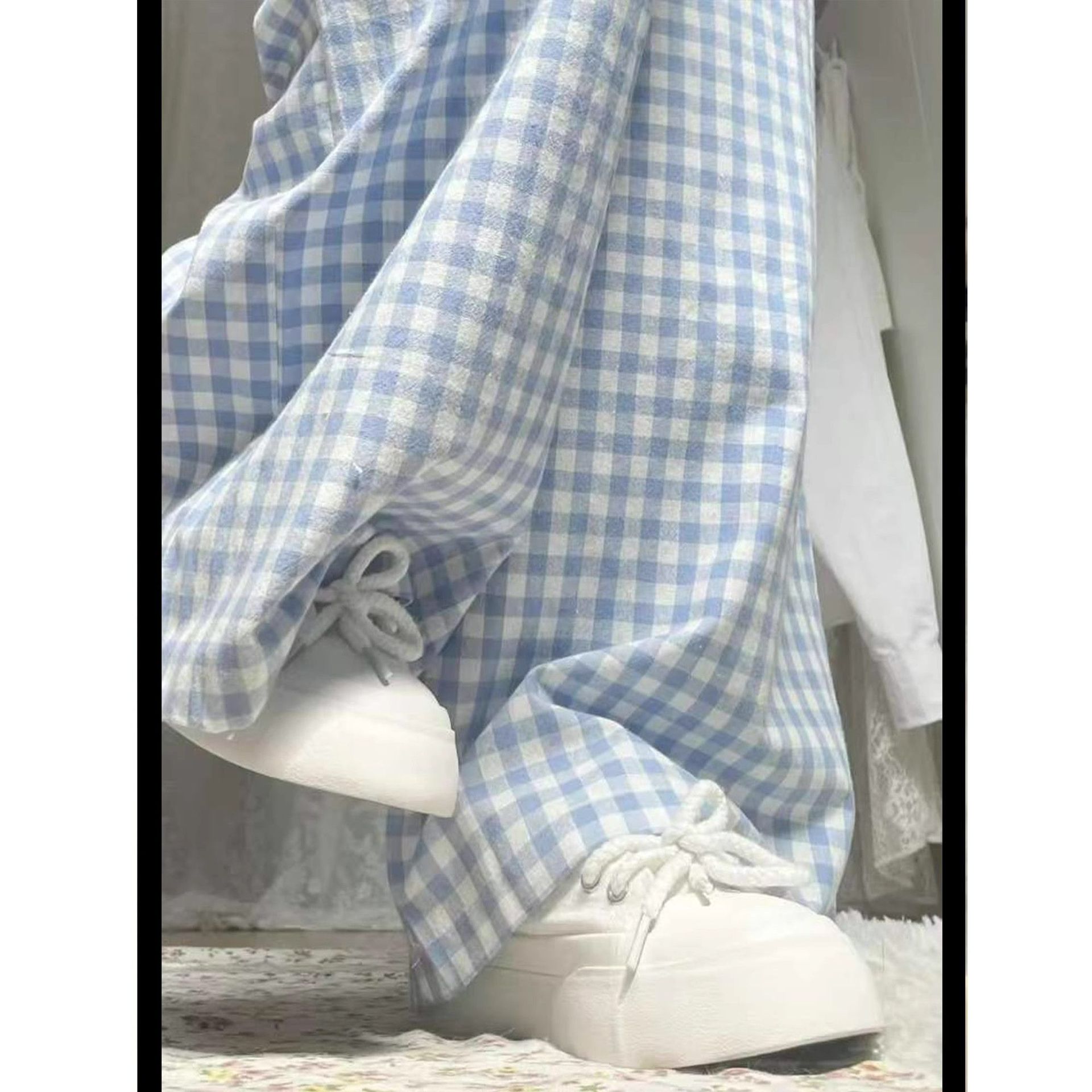 2025 봄 한국 스타일 레트로 블루 격자 무늬 넓은 다리 바지 여성용 게으른 바지 느슨한 스트레이트 더미 바지스토어 가기