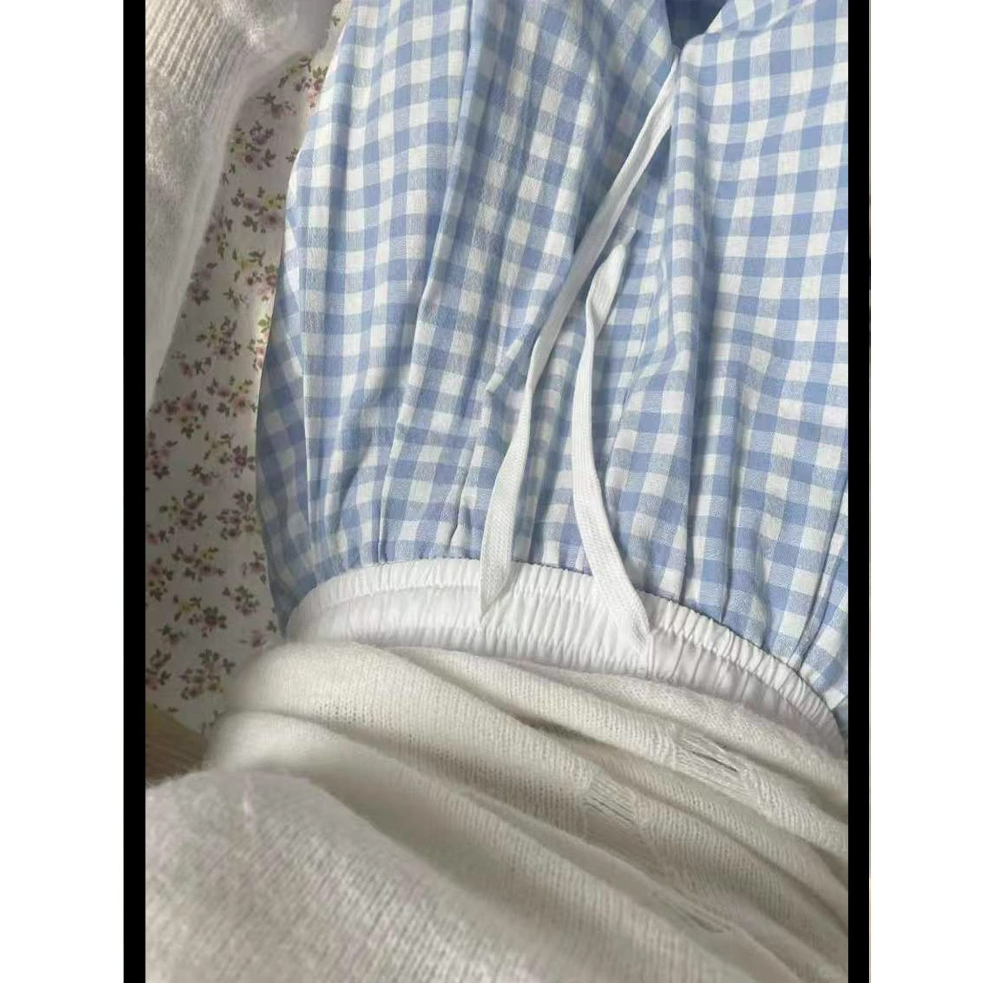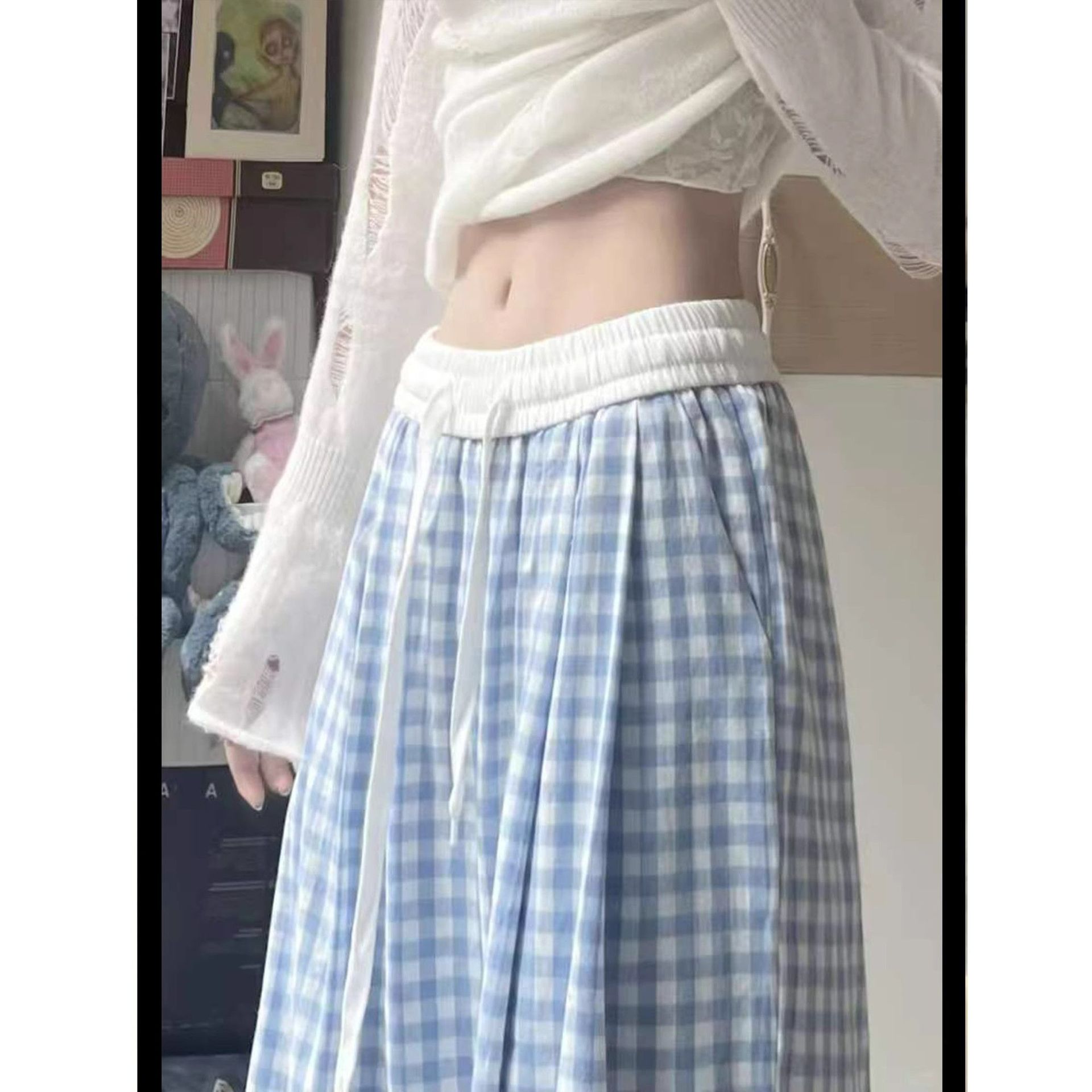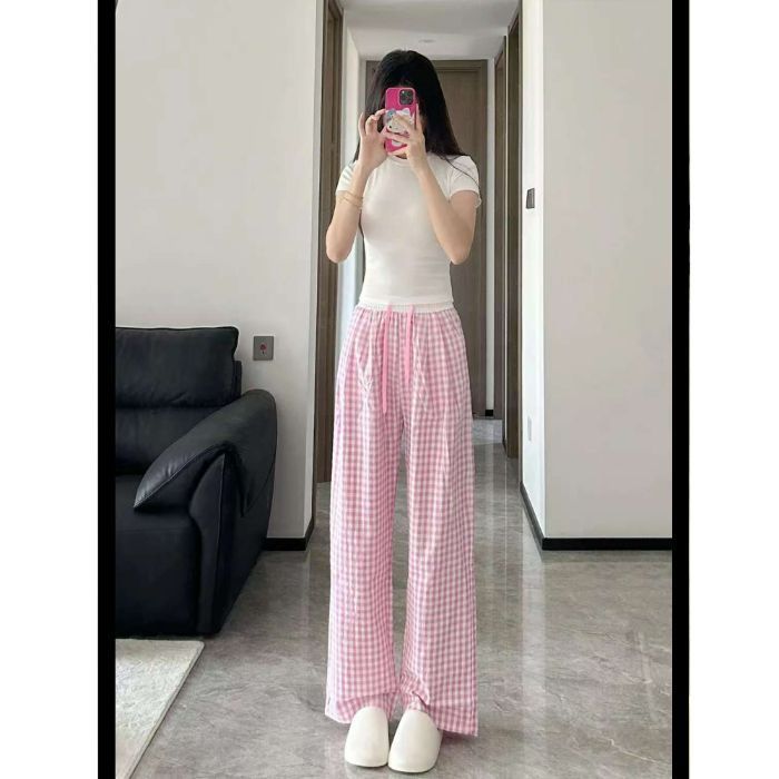 2025 봄 한국 스타일 레트로 블루 격자 무늬 넓은 다리 바지 여성용 게으른 바지 느슨한 스트레이트 더미 바지스토어 가기