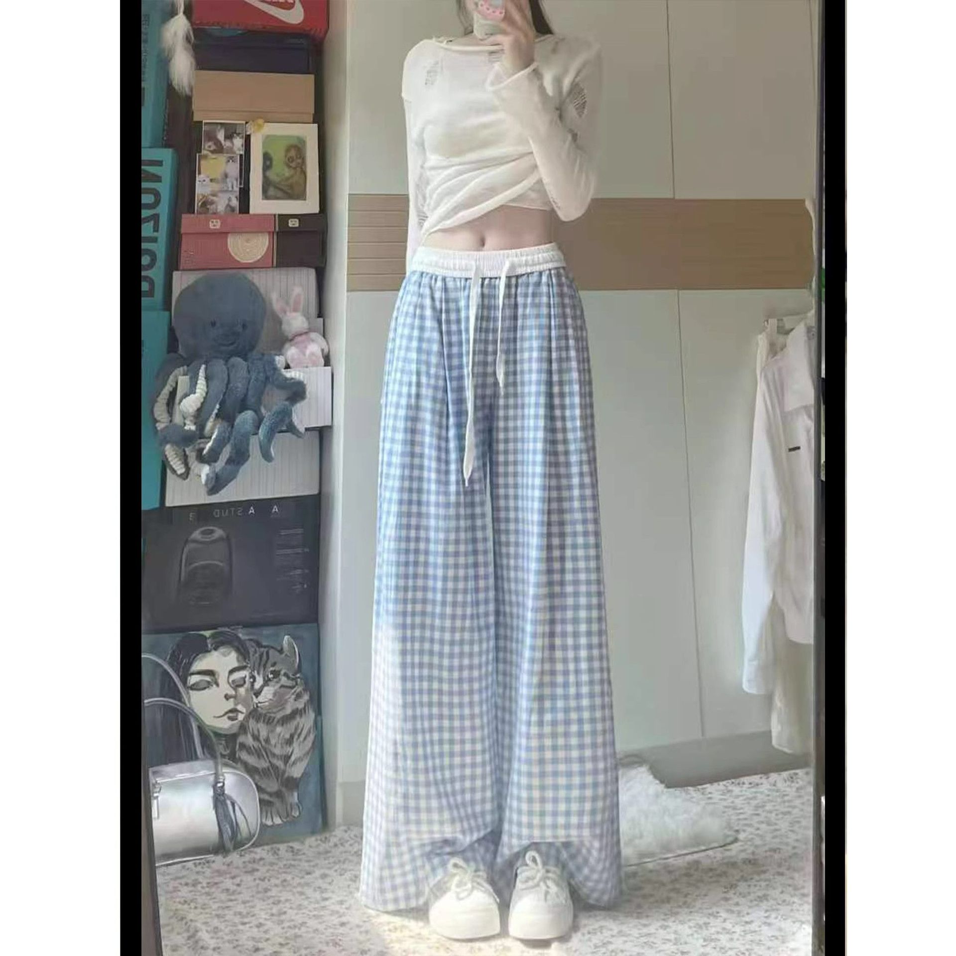 2025 봄 한국 스타일 레트로 블루 격자 무늬 넓은 다리 바지 여성용 게으른 바지 느슨한 스트레이트 더미 바지