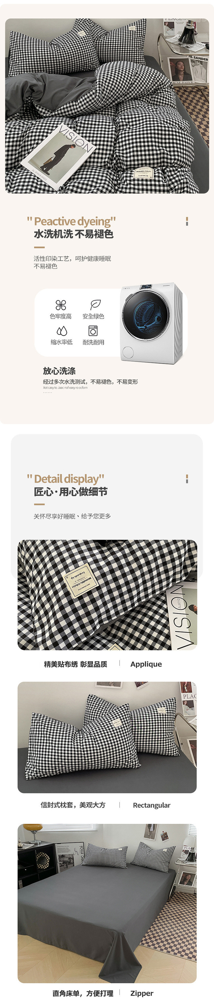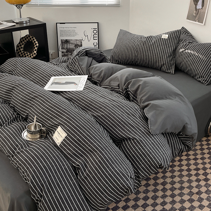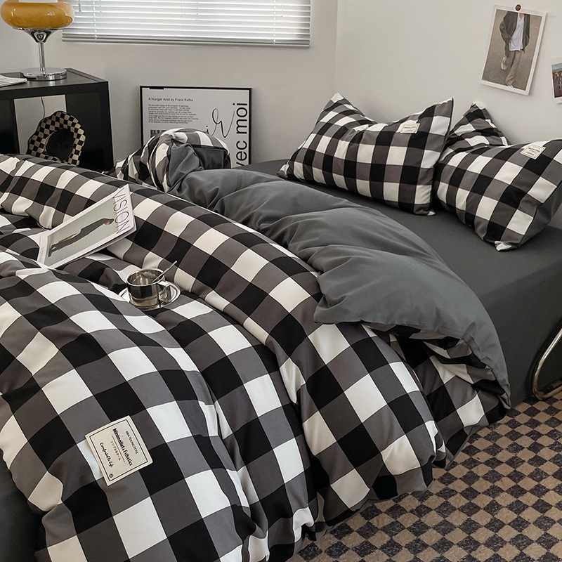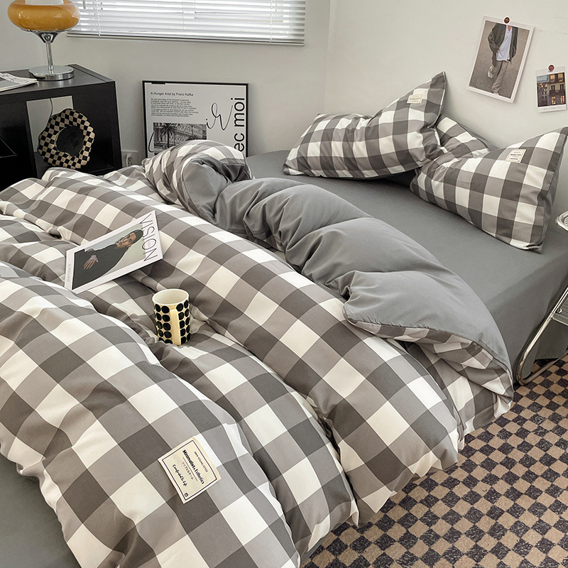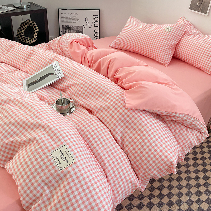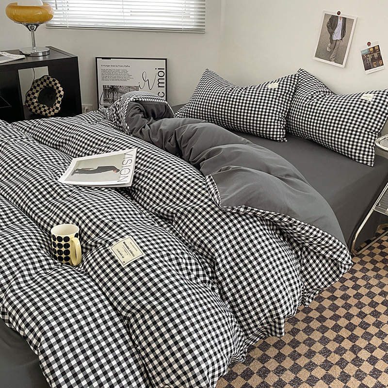 신선한 스타일 인쇄되지 않은 면화 간단한 격자 무늬 4 피스 세트 침대 커버 침대 시트 퀼트 커버 학생 기숙사 3 피스 세트스토어 가기