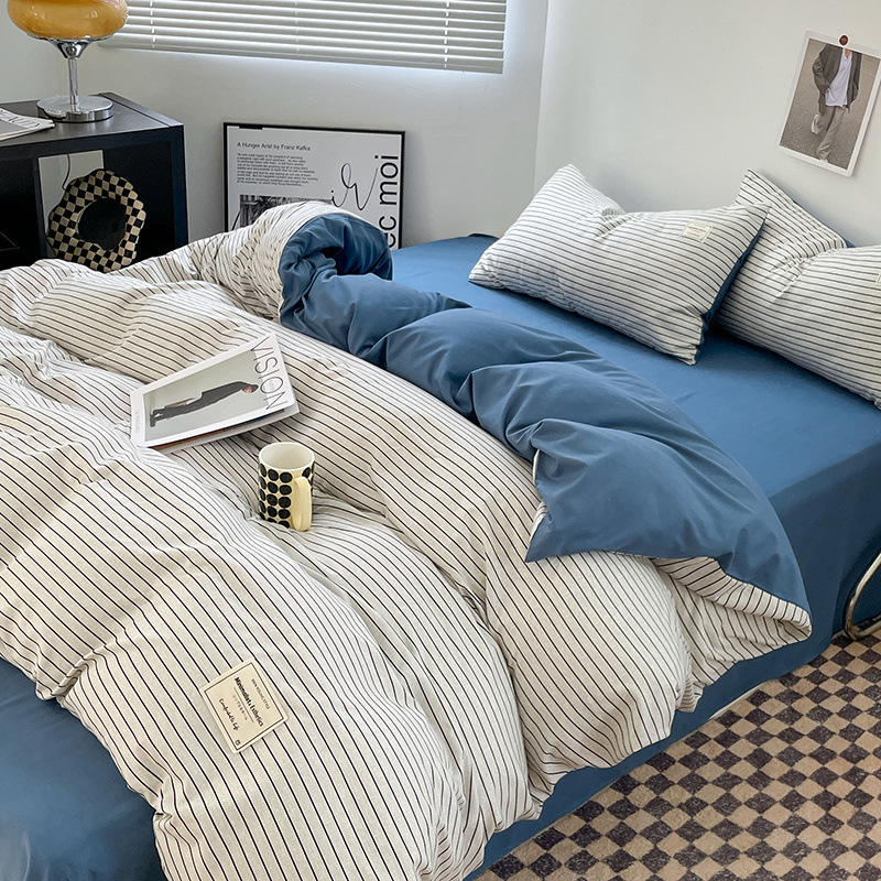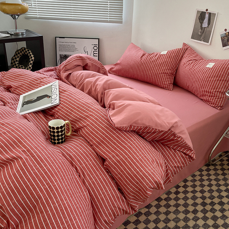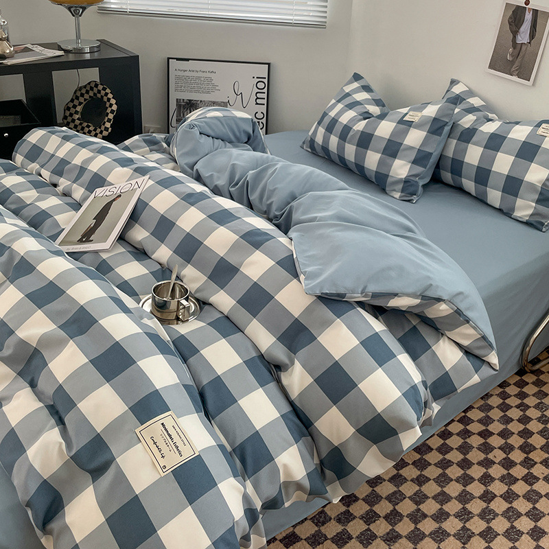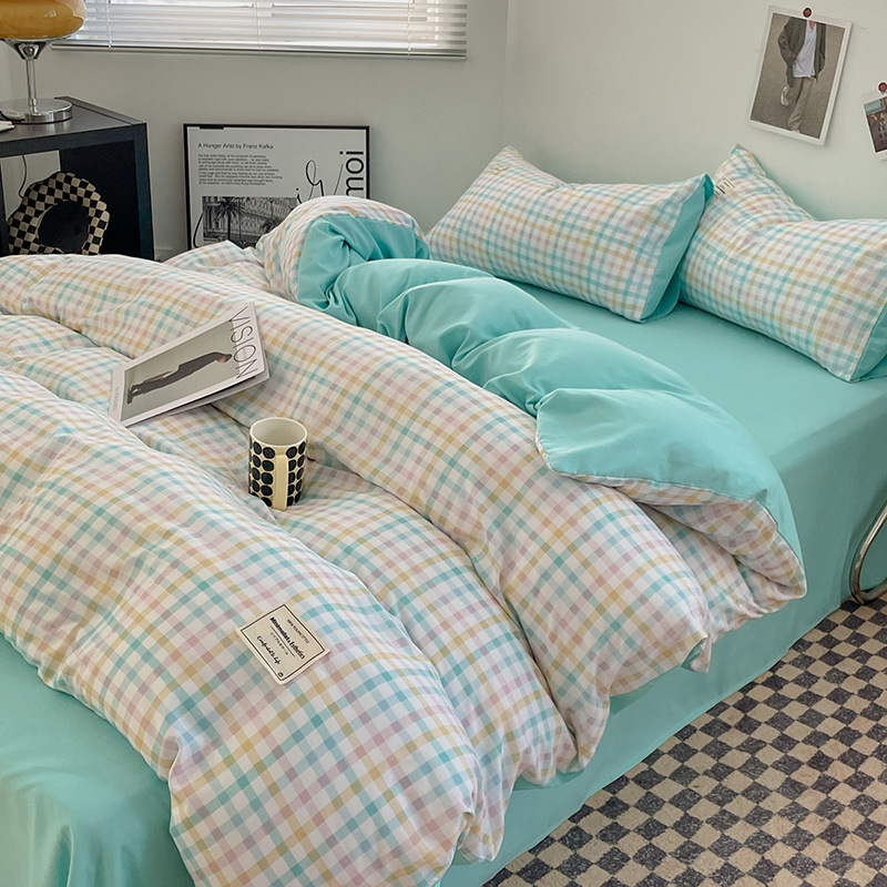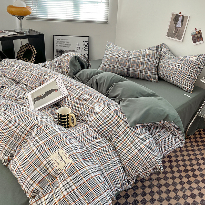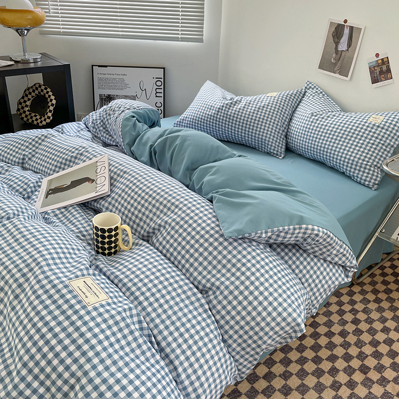 신선한 스타일 인쇄되지 않은 면화 간단한 격자 무늬 4 피스 세트 침대 커버 침대 시트 퀼트 커버 학생 기숙사 3 피스 세트