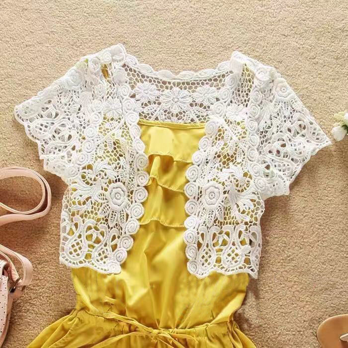 여름 올매치 반팔 작은 목도리 여자 여름 얇은 코트 레이스 니트웨어 할로우 웨이스트 코트 짧은 카디건 우아함