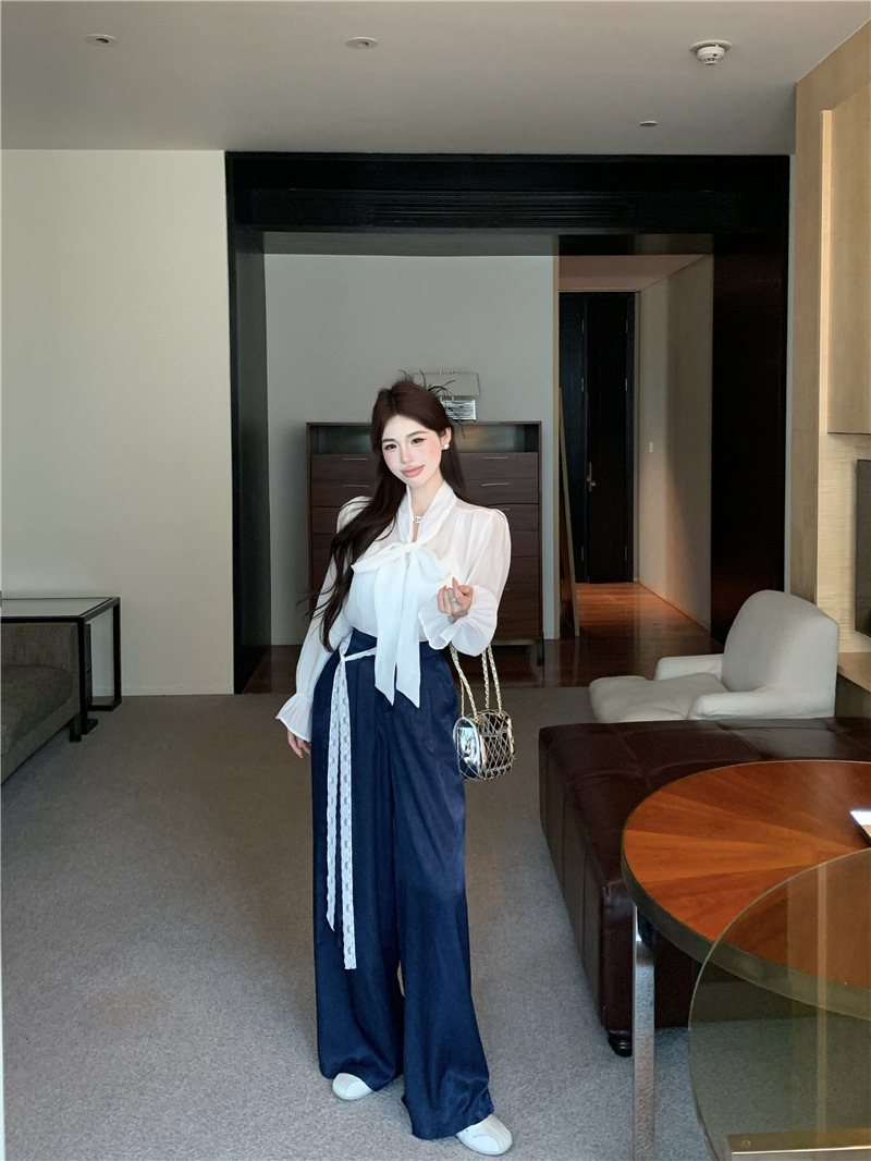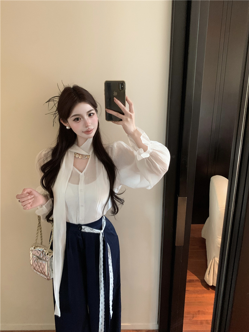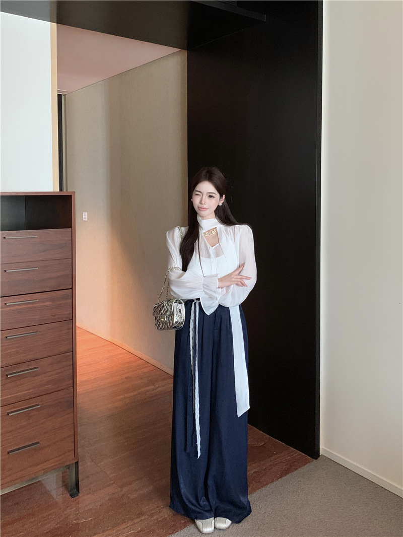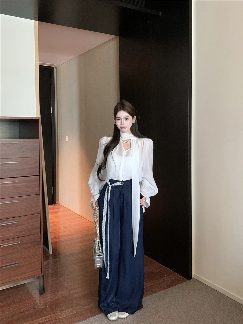 슈퍼 핫 우아한 화이트 혼 슬리브 V 넥 셔츠 2025 한국 블루 와이드 레그 팬츠 한풍 세련된 2 피스 세트