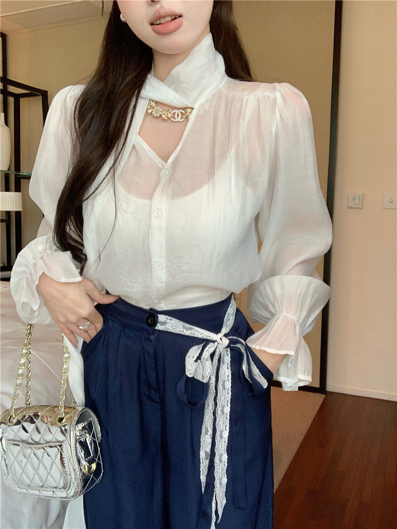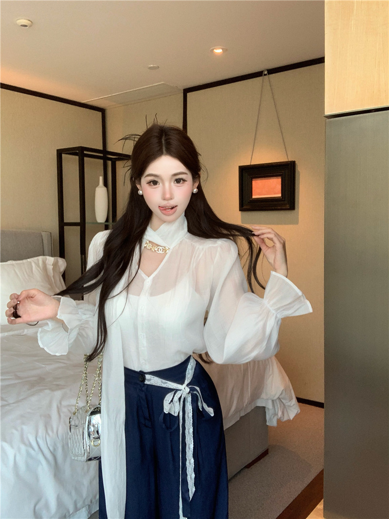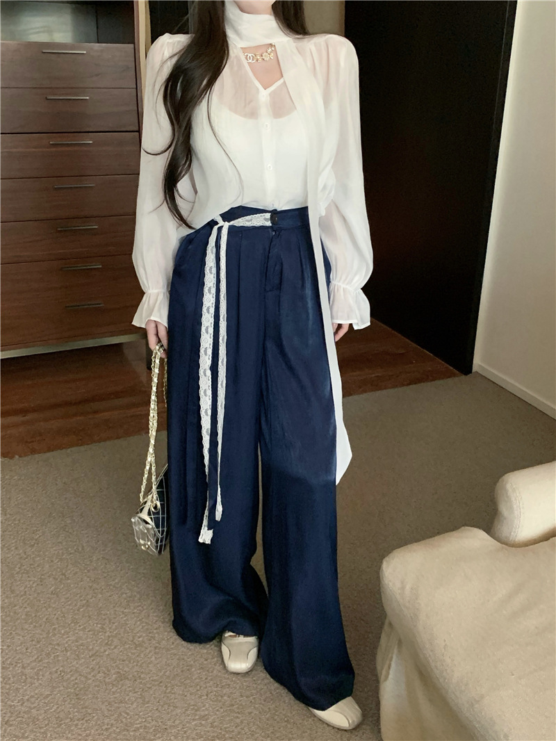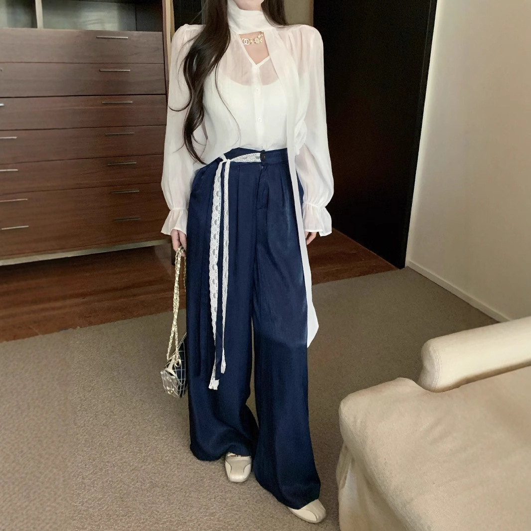 슈퍼 핫 우아한 화이트 혼 슬리브 V 넥 셔츠 2025 한국 블루 와이드 레그 팬츠 한풍 세련된 2 피스 세트