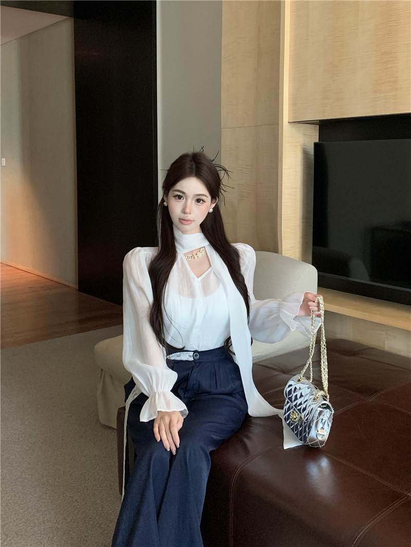 슈퍼 핫 우아한 화이트 혼 슬리브 V 넥 셔츠 2025 한국 블루 와이드 레그 팬츠 한풍 세련된 2 피스 세트스토어 가기