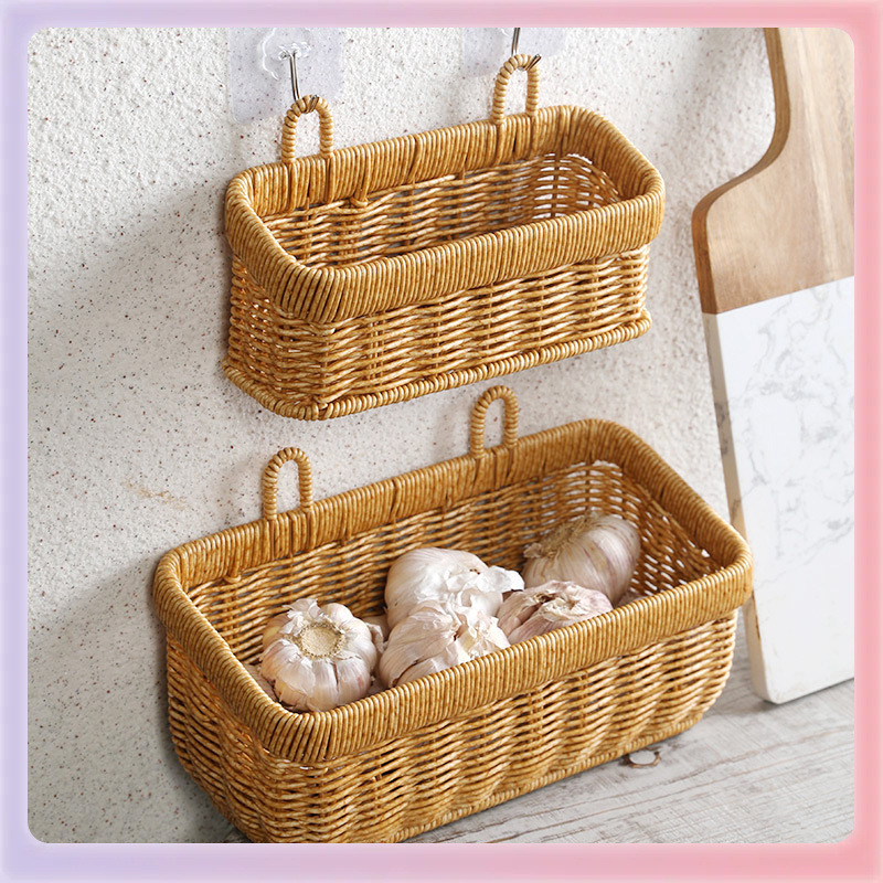 ✅생강 마늘 저장 바구니 짠 바구니 교수형 바구니 주방 생강 마늘 양파 계란 과일 벽 장착 바구니 모방 등나무 저장 상자