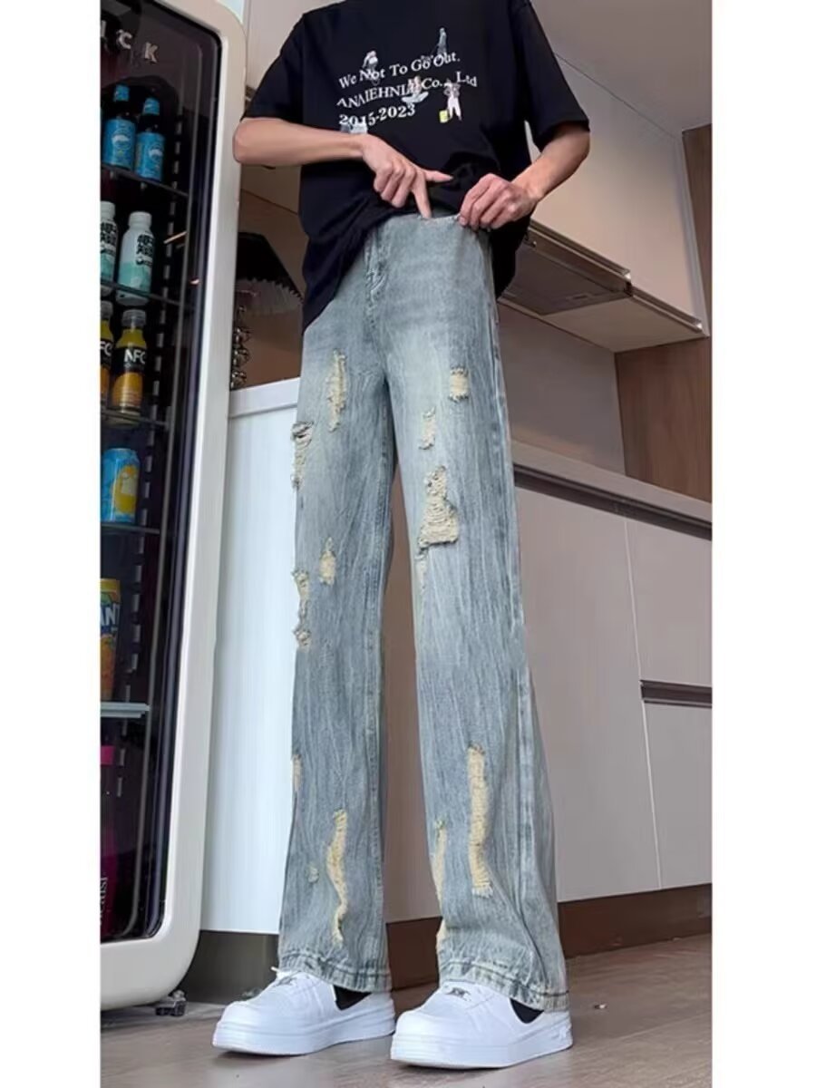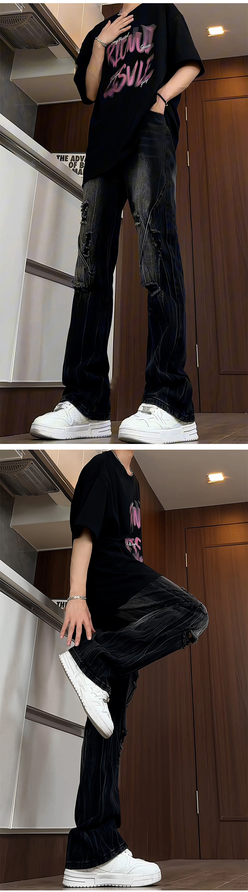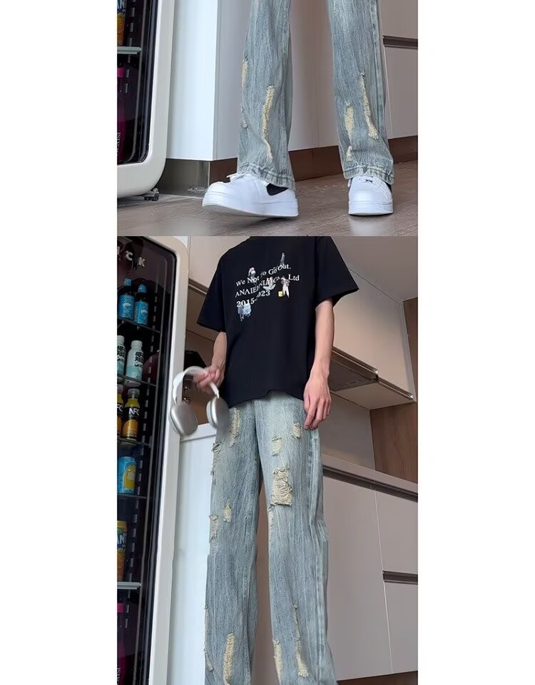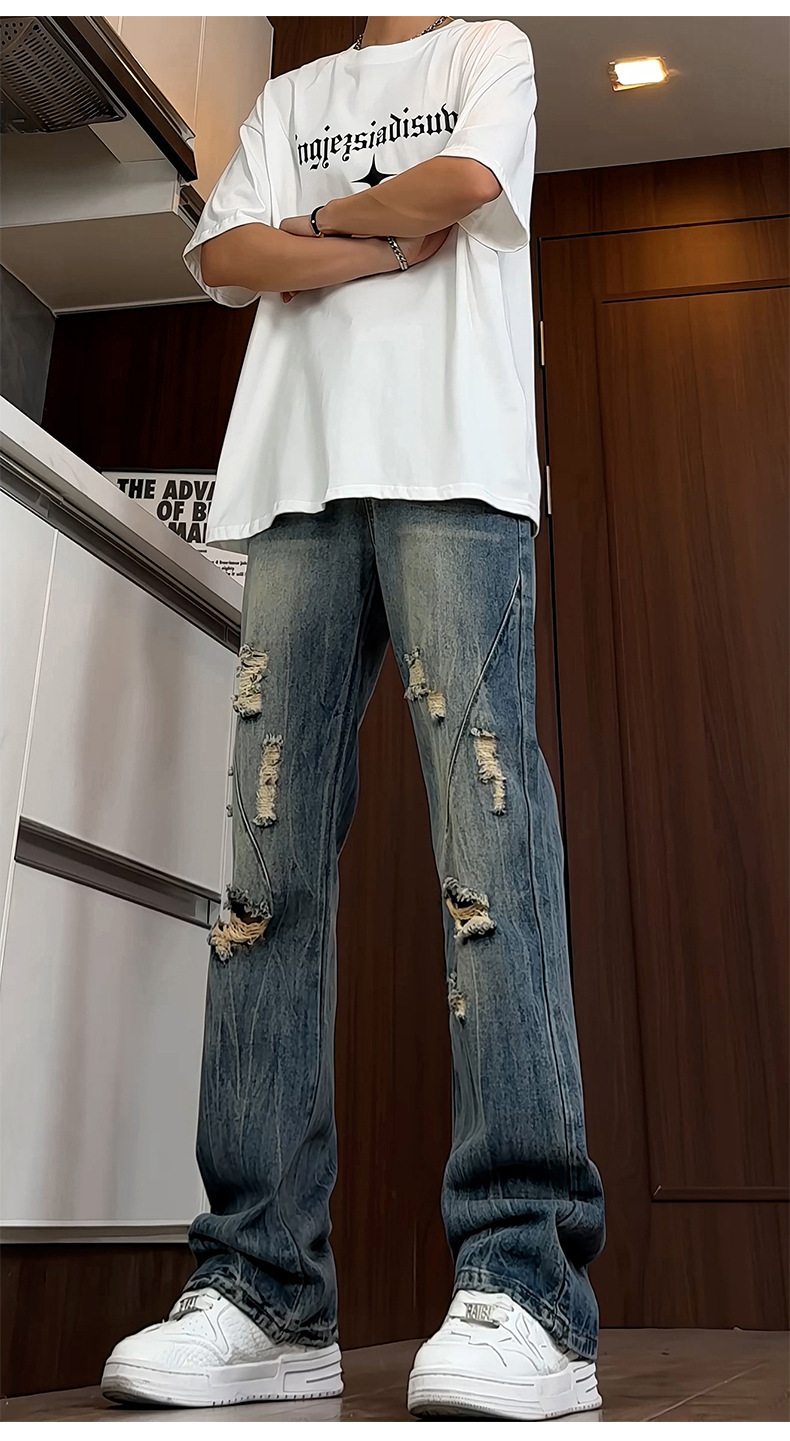 블랙 리핑 시미 타르 청바지 남성 여름 아메리칸 스타일 하이 스트리트 바이브 바지 키가 큰 긴 슬림 핏 마이크로 라르 바지스토어 가기