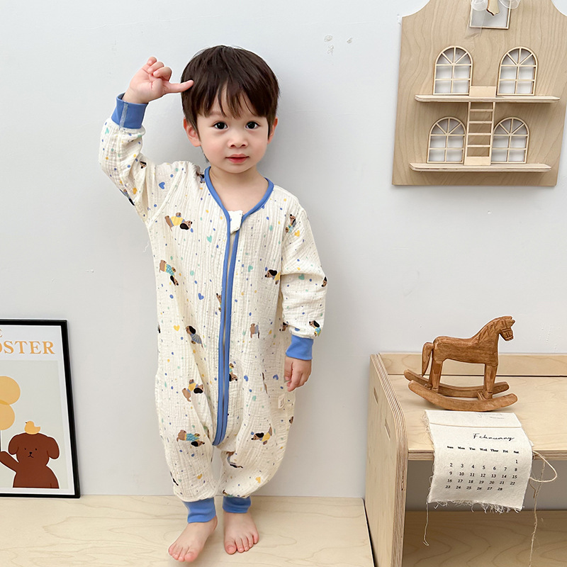 2025 어린이 거즈 침낭 얇은 긴 소매 면사 점프 수트 남성과 여성의 보물 면화 통기성 등산 옷 머리카락 한 세대스토어 가기