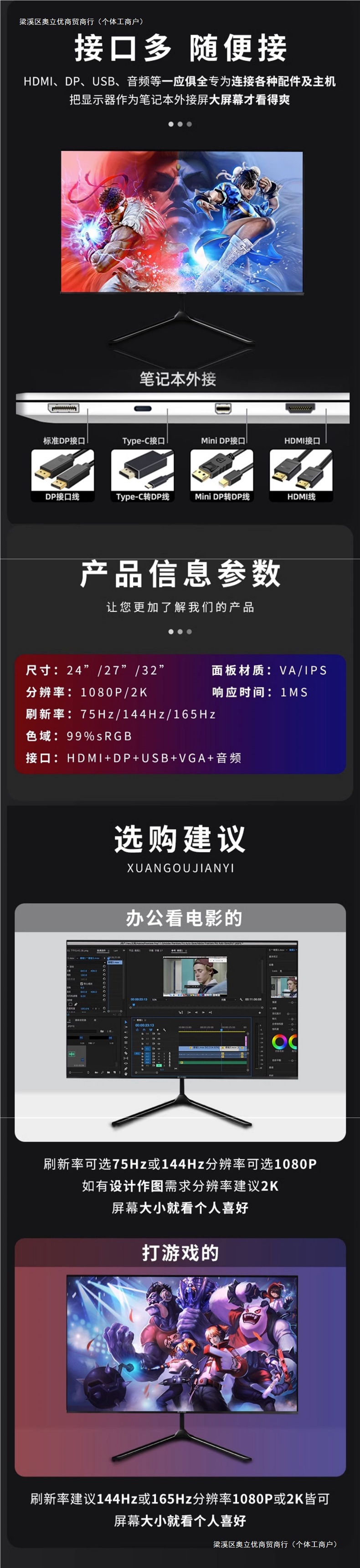 24인치 144hz 모니터 2K 오피스 27inch e-스포츠 게임 곡선 데스크탑 컴퓨터 디스플레이 화면 외부