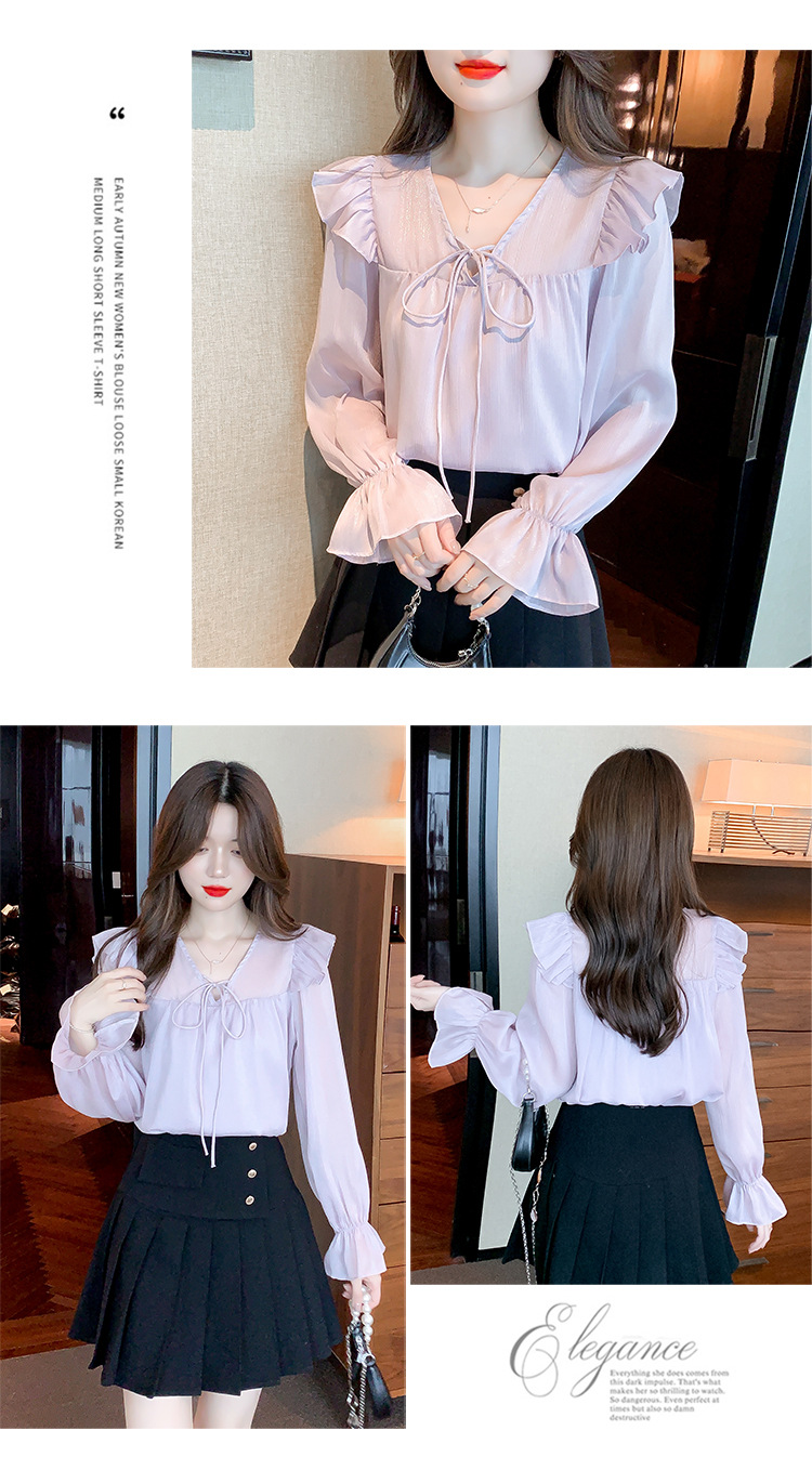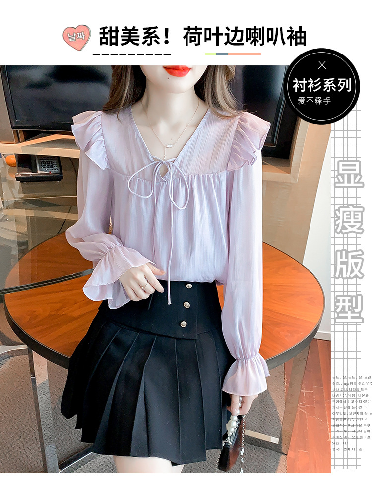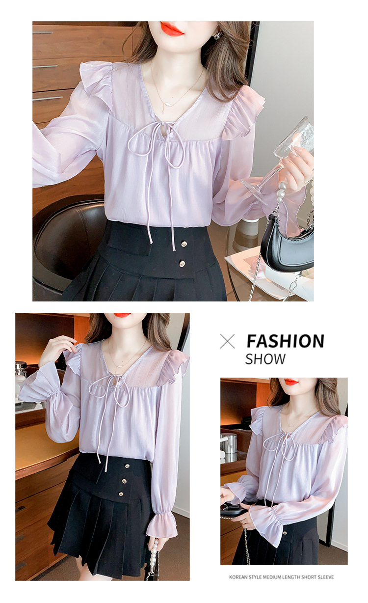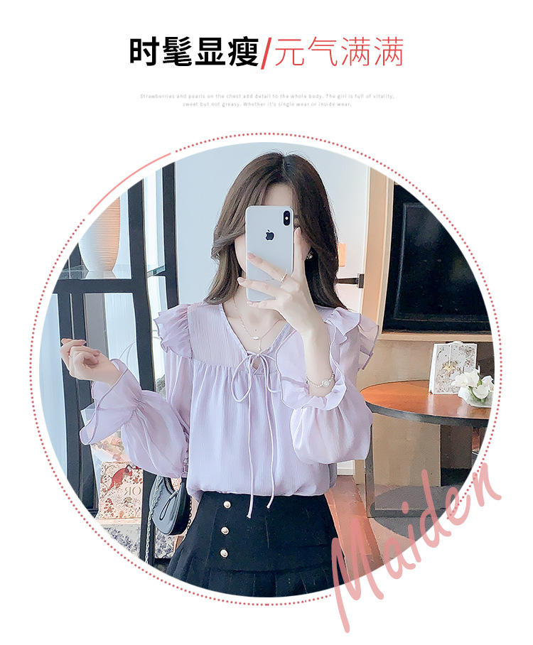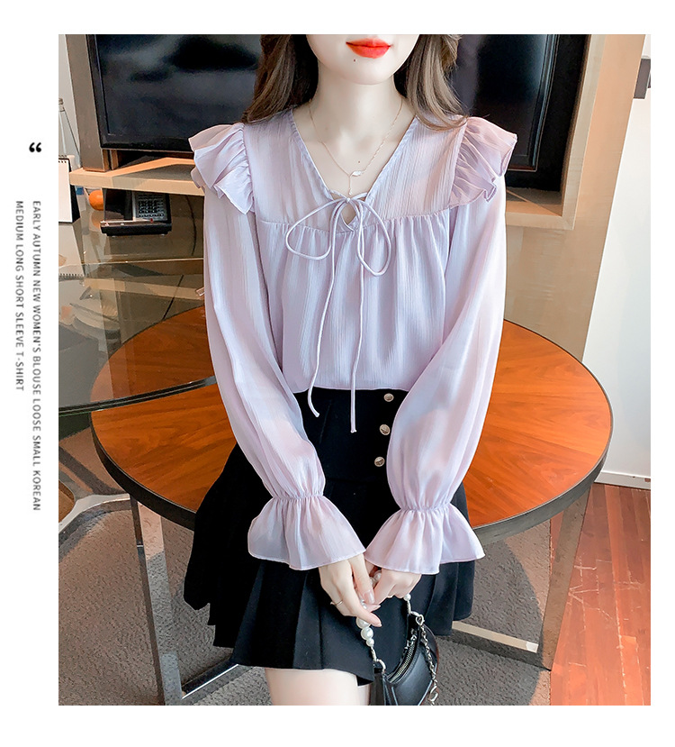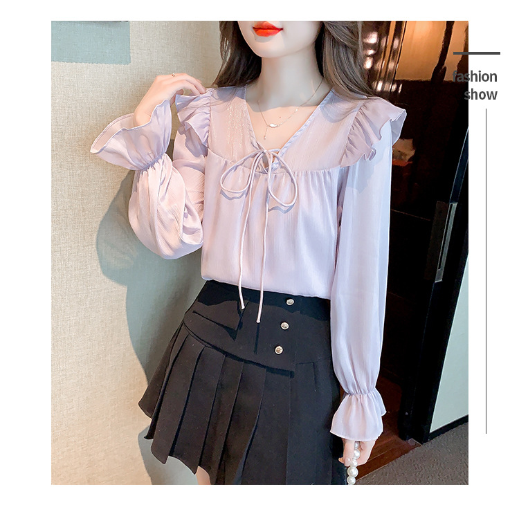 2025 봄 새로운 레이스 셔츠 쉬폰 셔츠 혼 소매 풀오버 달콤한 원사 여성용 셔츠 도매 한국 버전스토어 가기