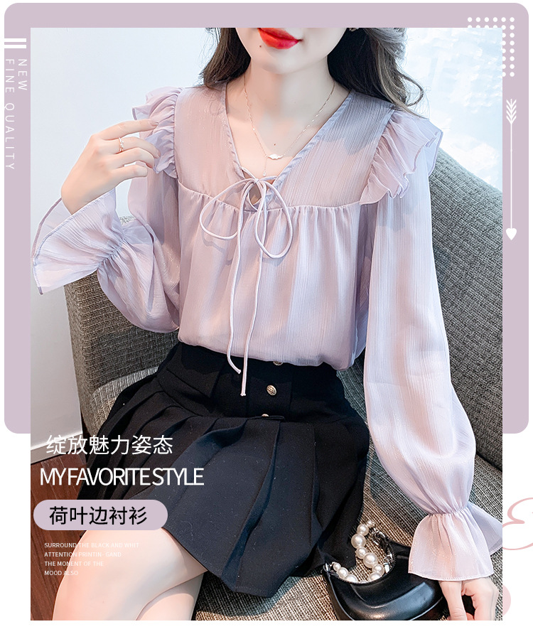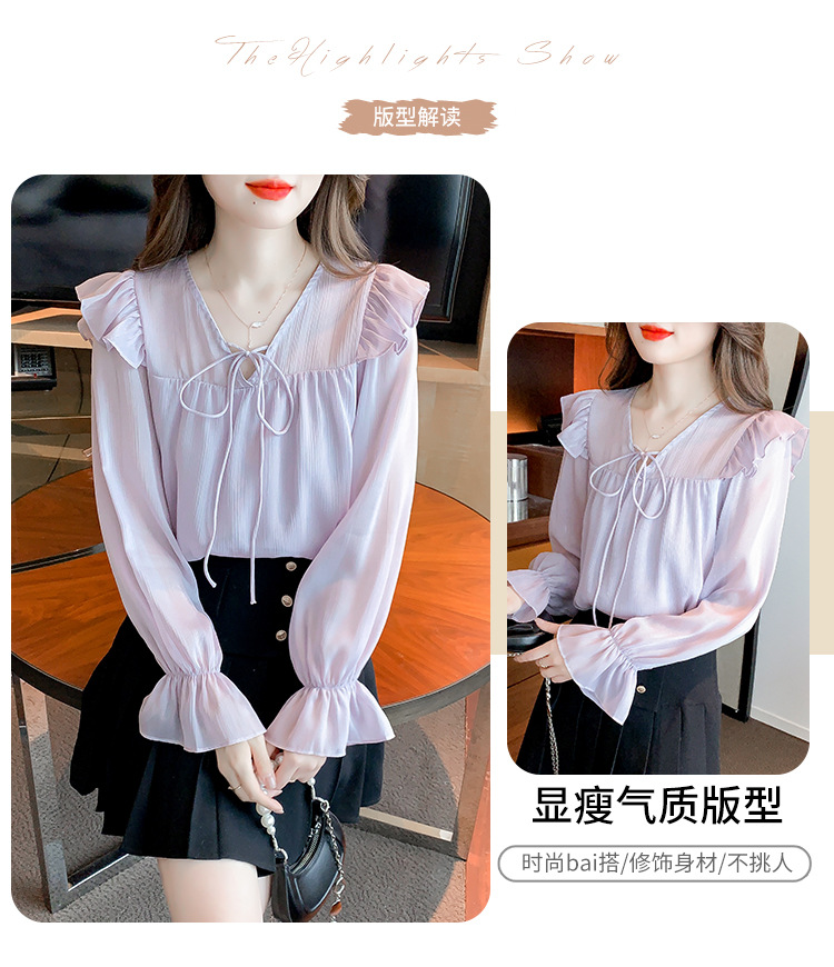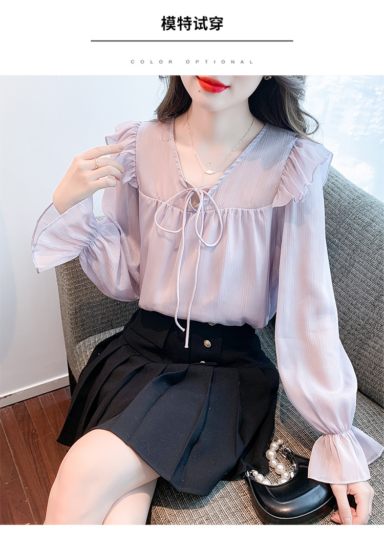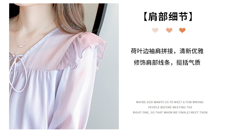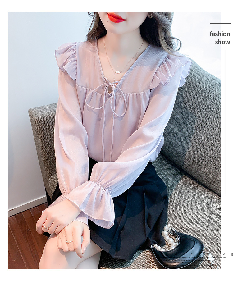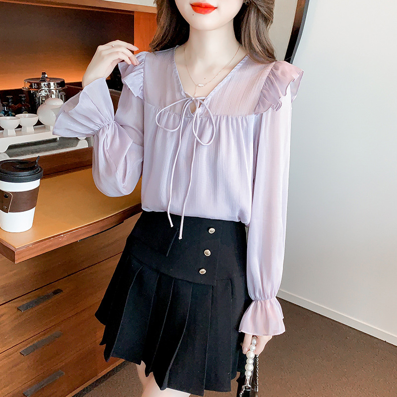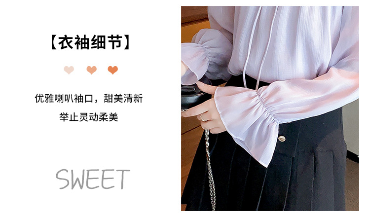 2025 봄 새로운 레이스 셔츠 쉬폰 셔츠 혼 소매 풀오버 달콤한 원사 여성용 셔츠 도매 한국 버전스토어 가기