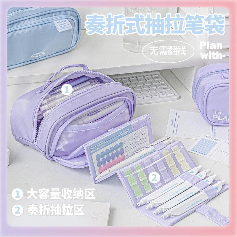 ✅Planwith Friends Plan Korean 확장 가능한 연필 가방 높은 색상 값 다중 파티션 문구 상자 학생 대용량 문구