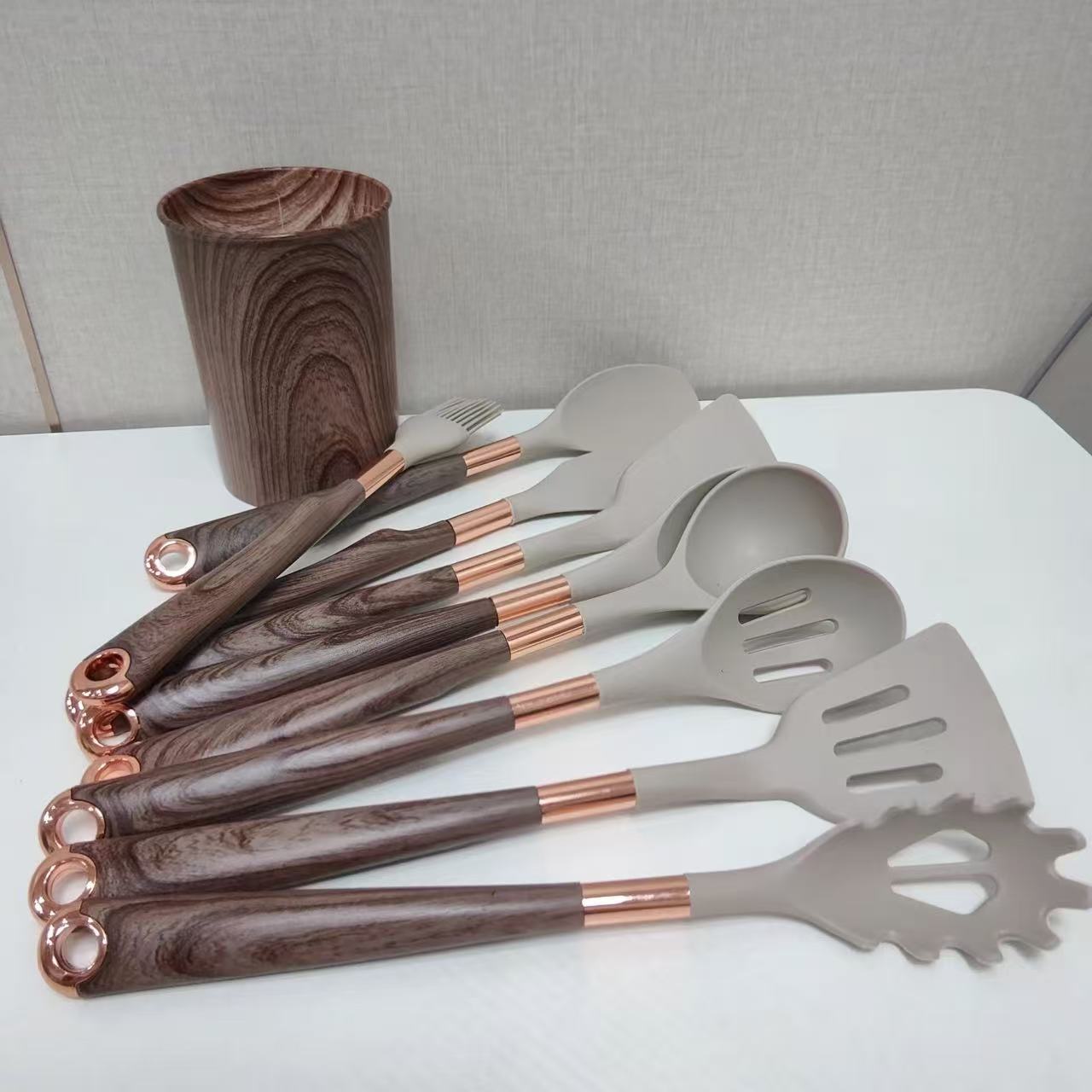 새로운 실리콘 주방 용품 세트 11 피스 세트 골드 도금 나뭇결 손잡이 비 스틱 팬 고온 저항하는 가정 요리 삽 숟가락
