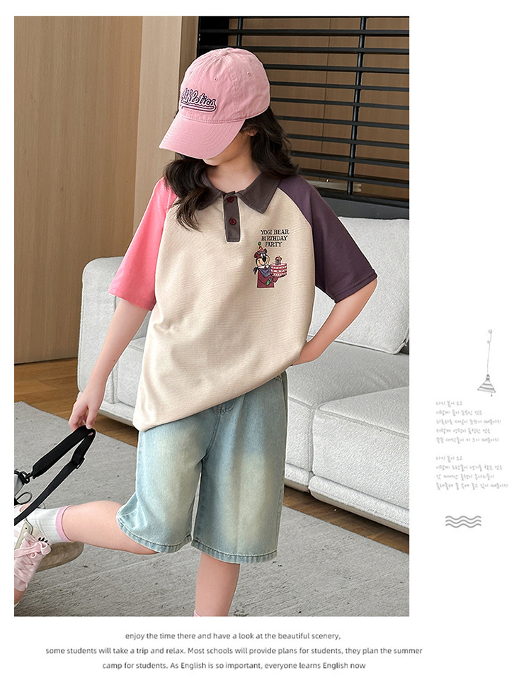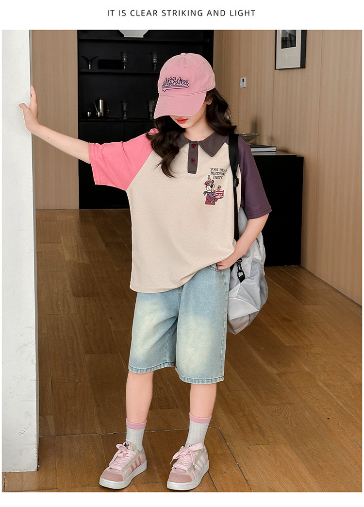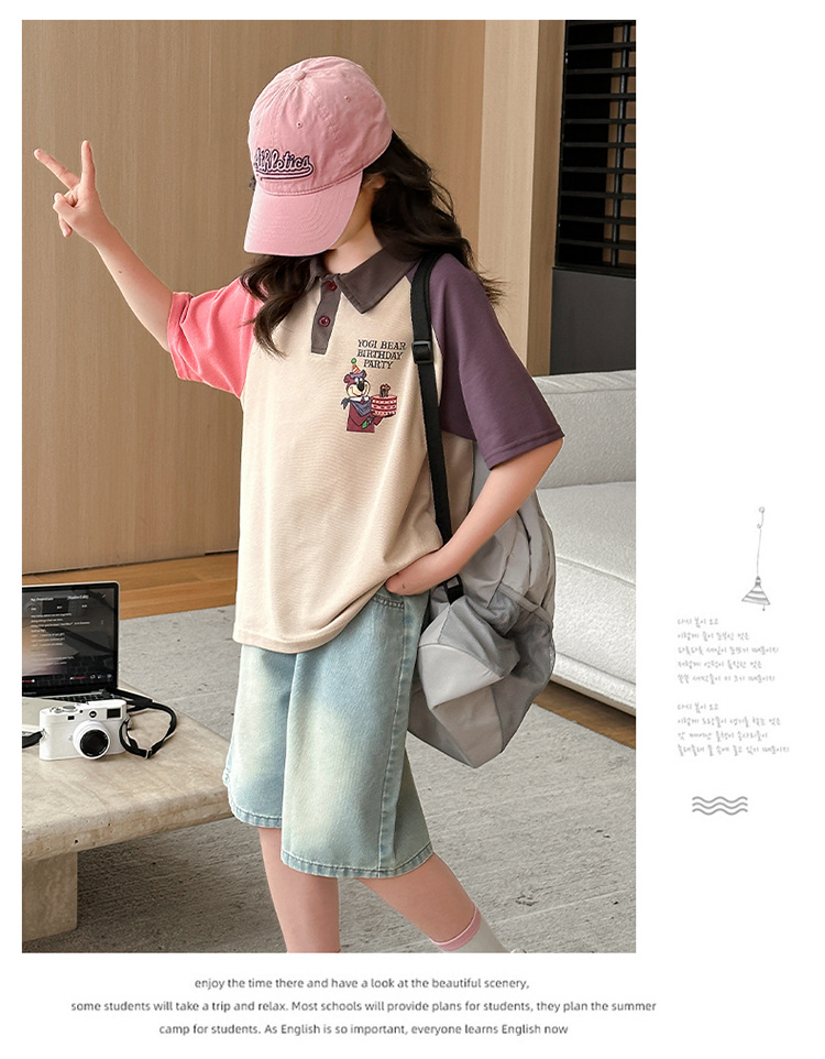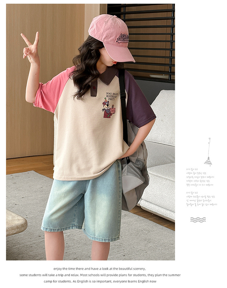 여자 여름 폴로 셔츠 반팔 티셔츠 2025 새로운 스타일 스티칭 대조 컬러 반소매 만화 캐주얼 탑 트렌디스토어 가기