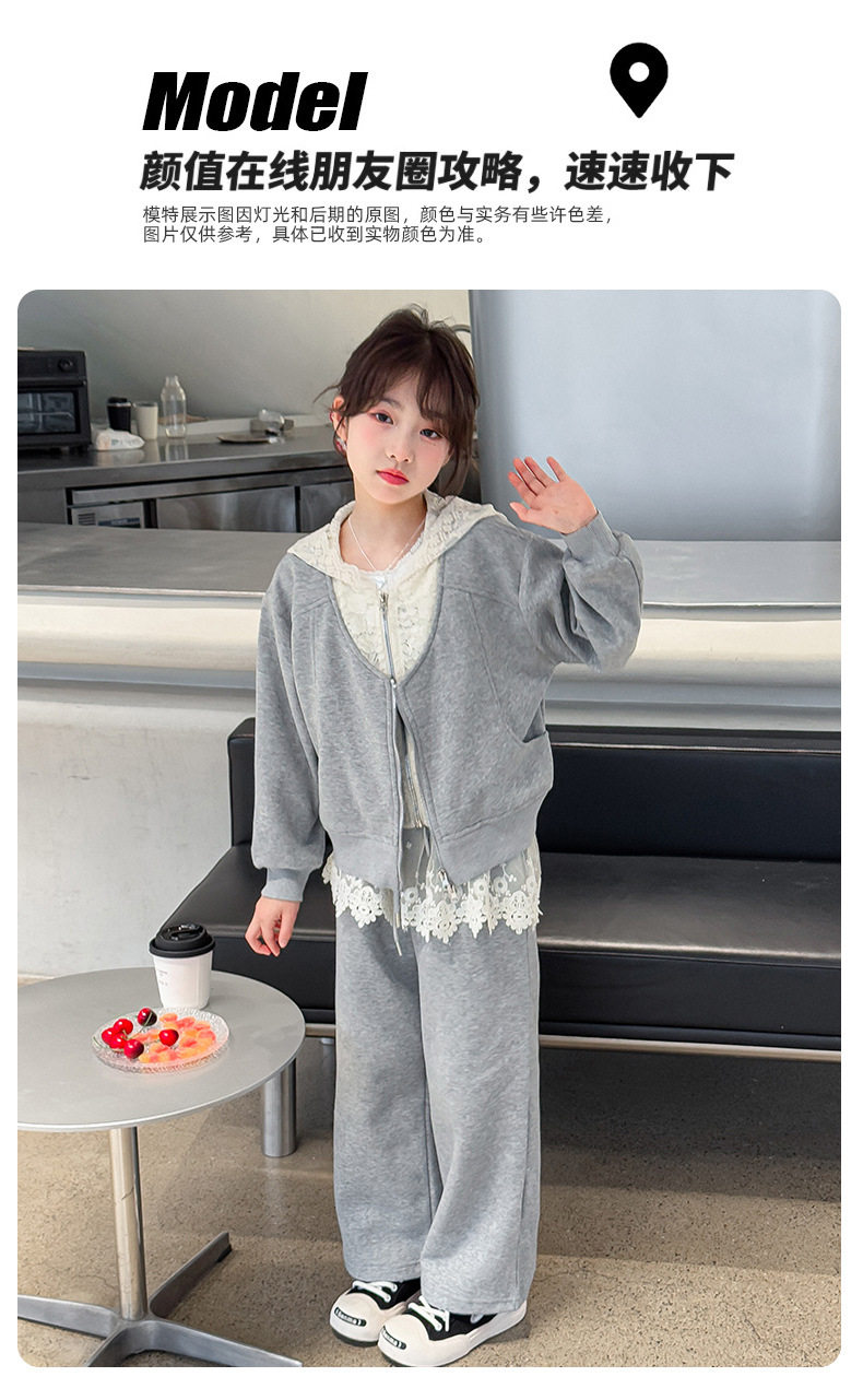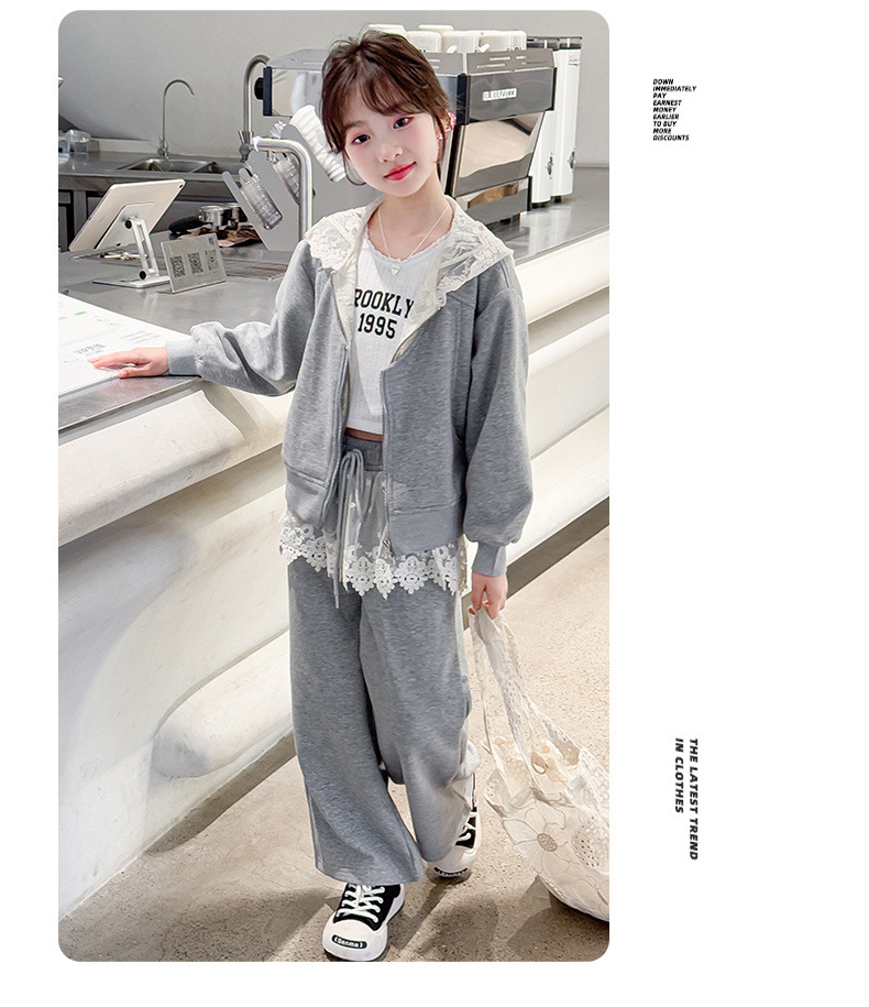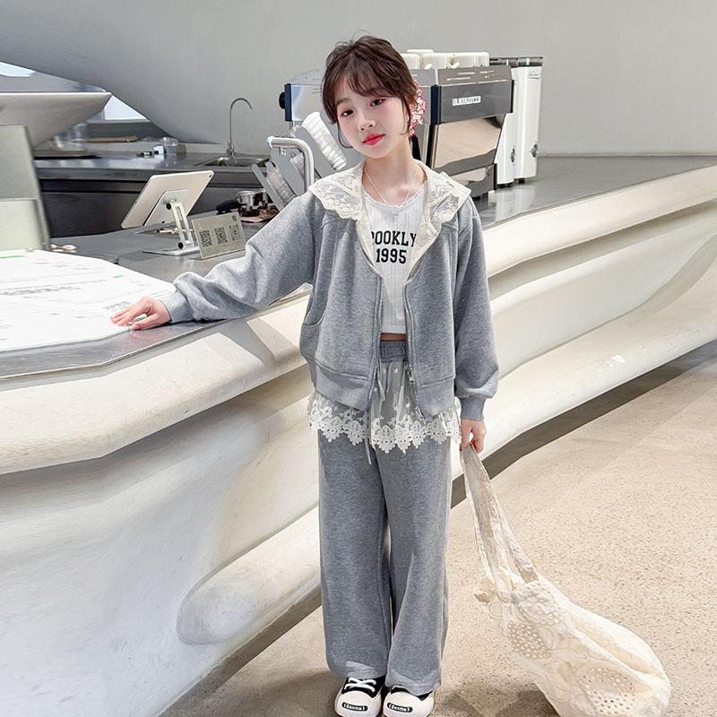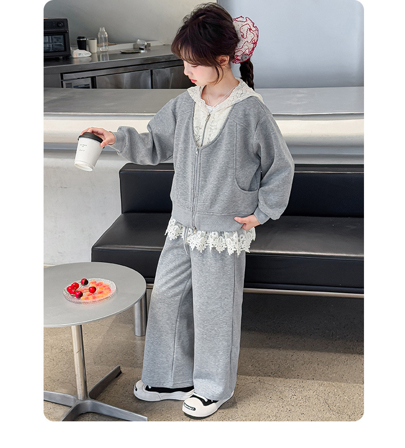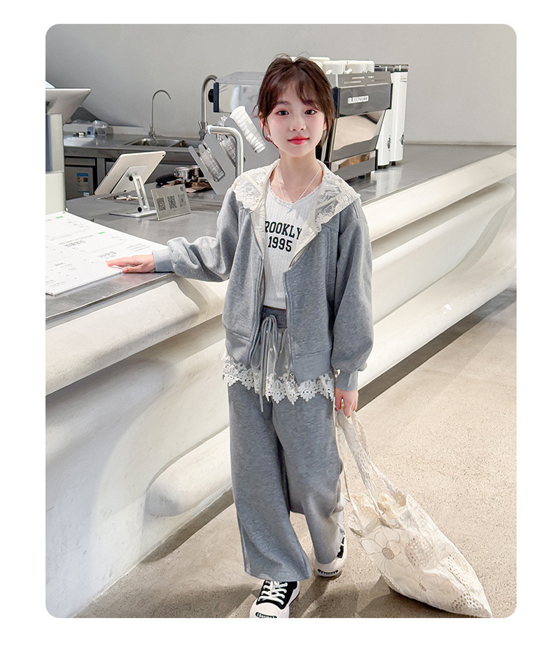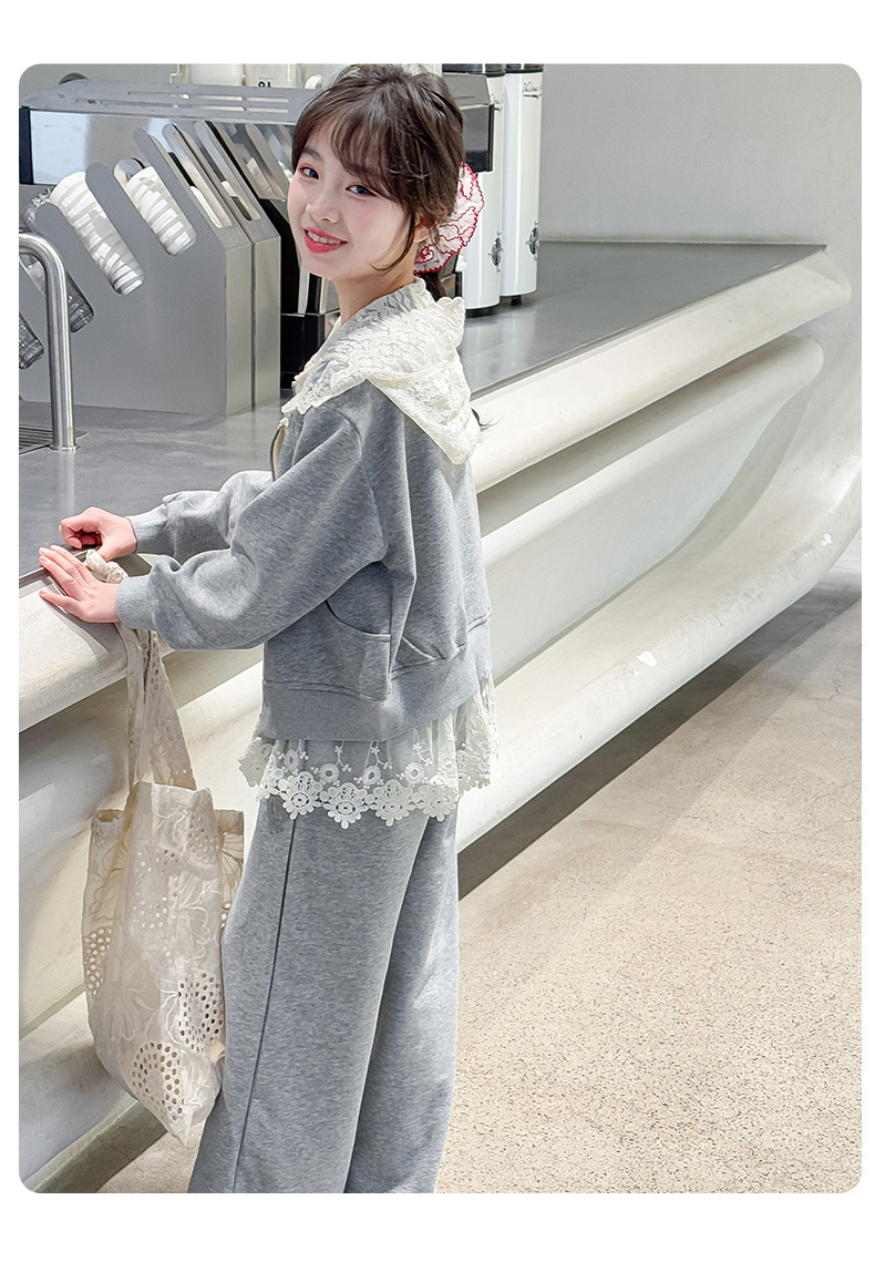 여자 스포츠 세트 후드 니트 스웨터 캐주얼 레이스 산소 카디건 재킷 바느질 바지 투피스 세트
