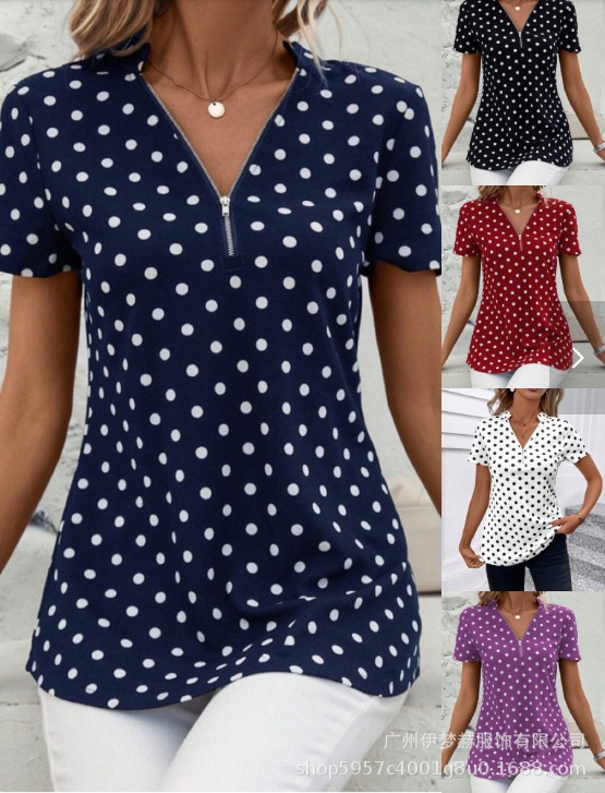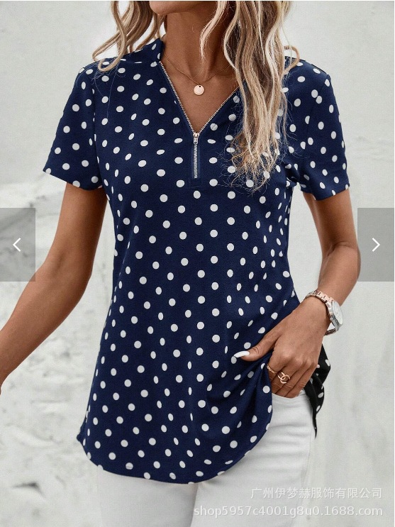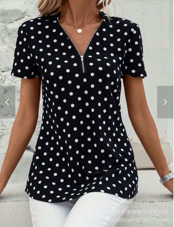 아마존 2025 유럽과 미국 국경 대외 무역 여성의 새로운 웨이브 도트 인쇄 지퍼 v-neck 짧은 소매 셔츠스토어 가기