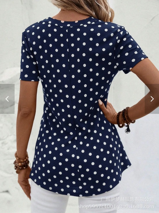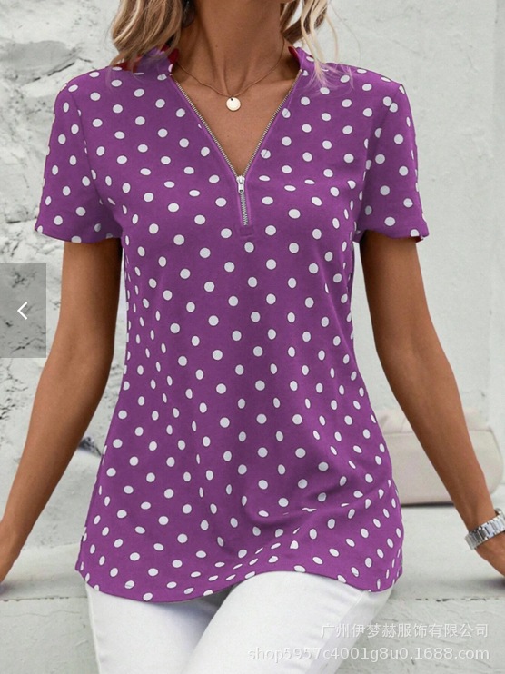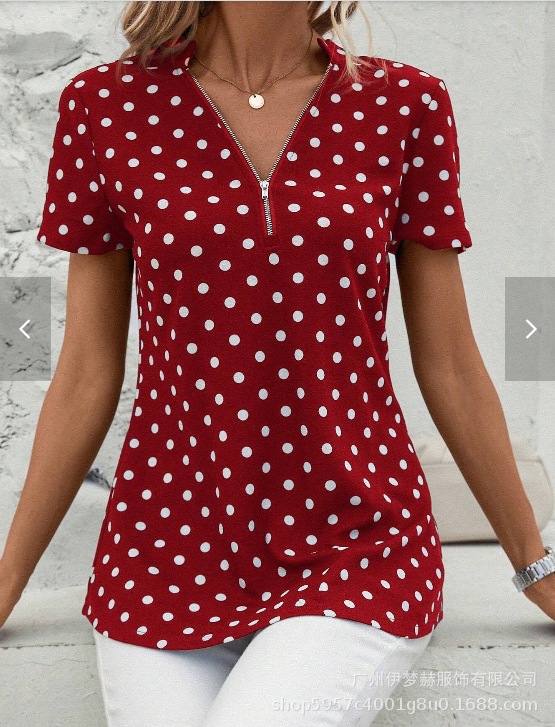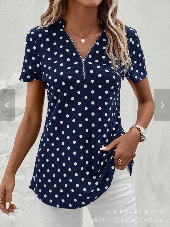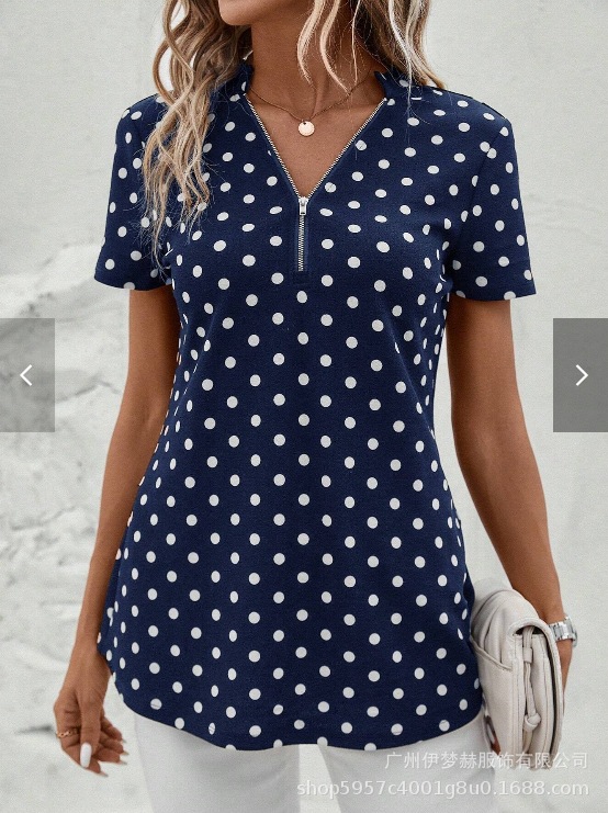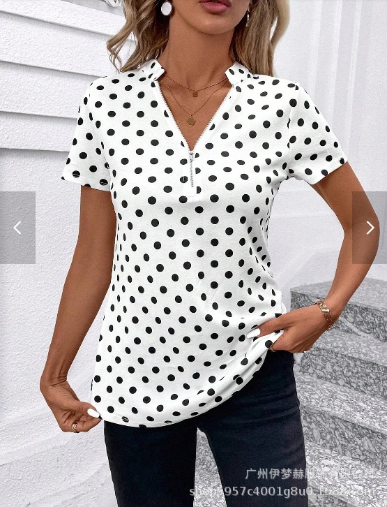 아마존 2025 유럽과 미국 국경 대외 무역 여성의 새로운 웨이브 도트 인쇄 지퍼 v-neck 짧은 소매 셔츠