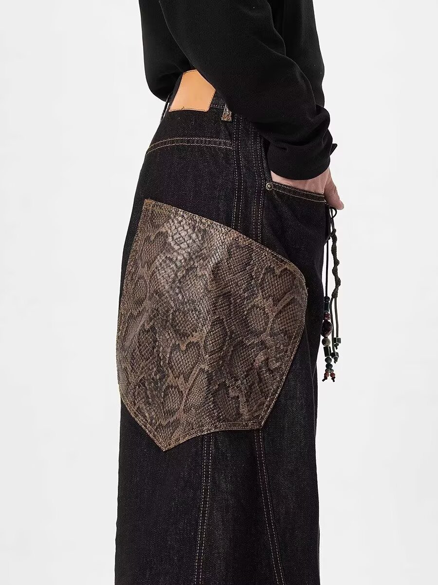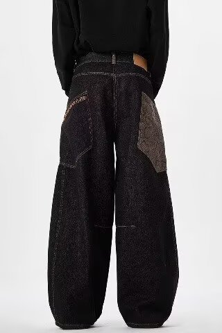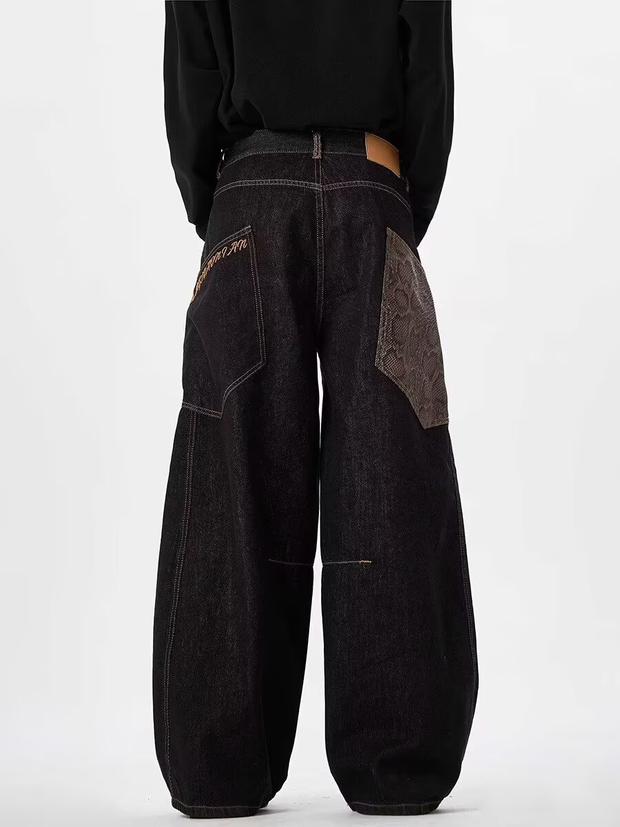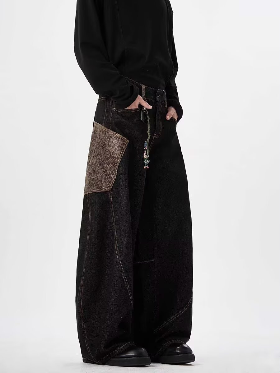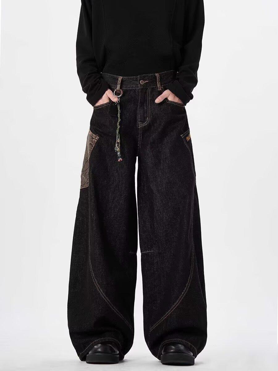 아메리칸 스타일 레트로 블랙 시미 타르 청바지 2025 디자인 바느질 큰 포켓 느슨한 직선 다리 넓은 다리 바지스토어 가기