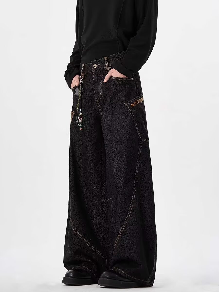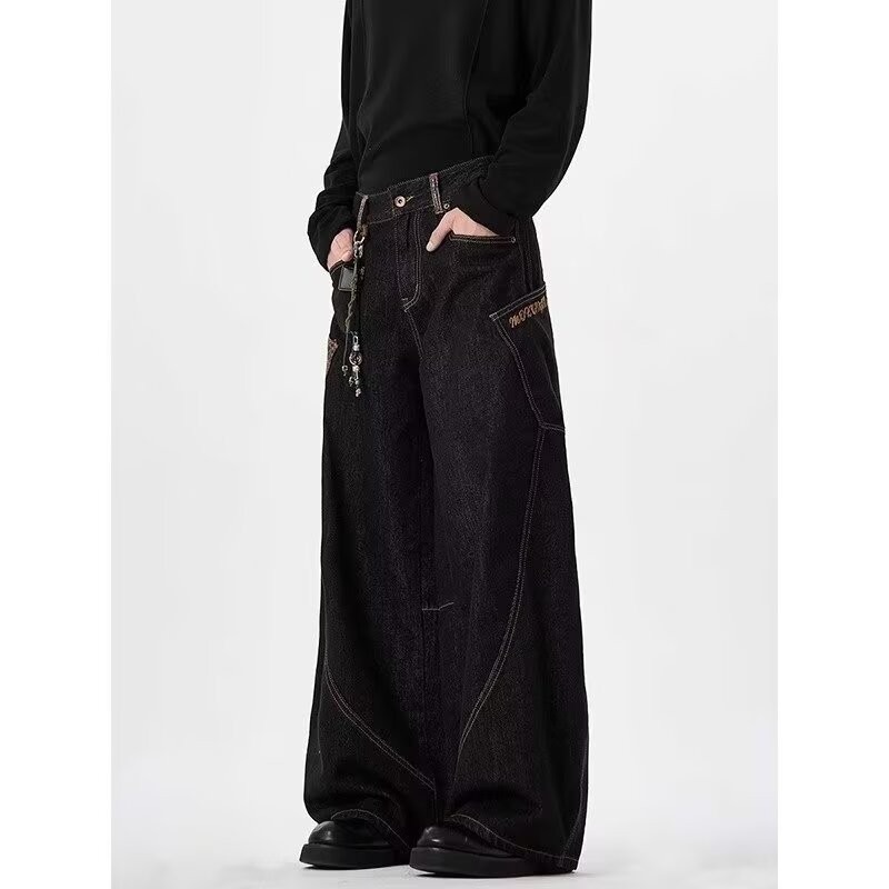아메리칸 스타일 레트로 블랙 시미 타르 청바지 2025 디자인 바느질 큰 포켓 느슨한 직선 다리 넓은 다리 바지
