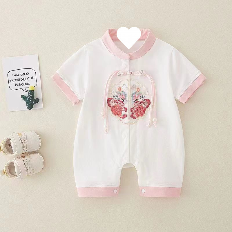• 화이트 [핑크 엣지 자수 반팔] 점프수트