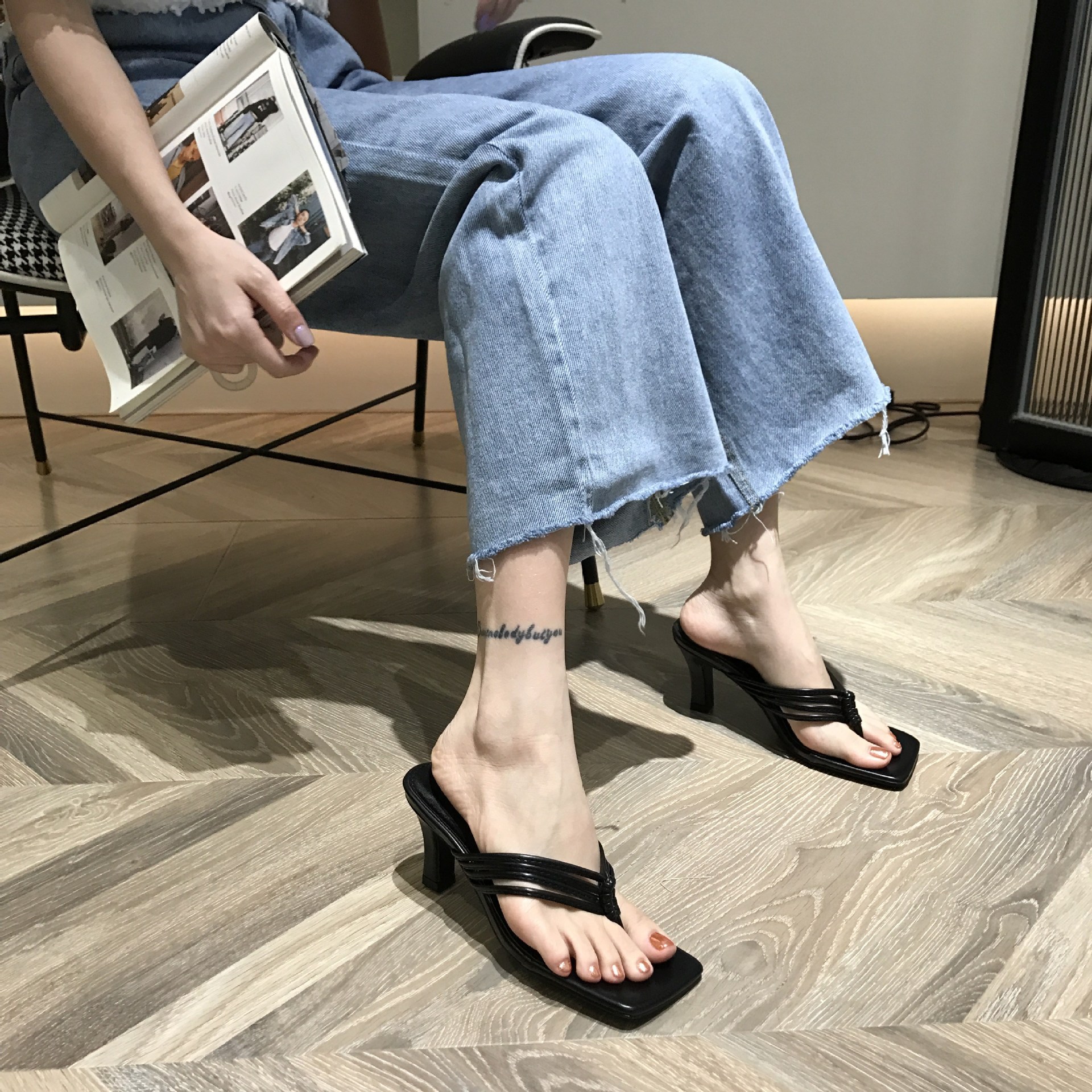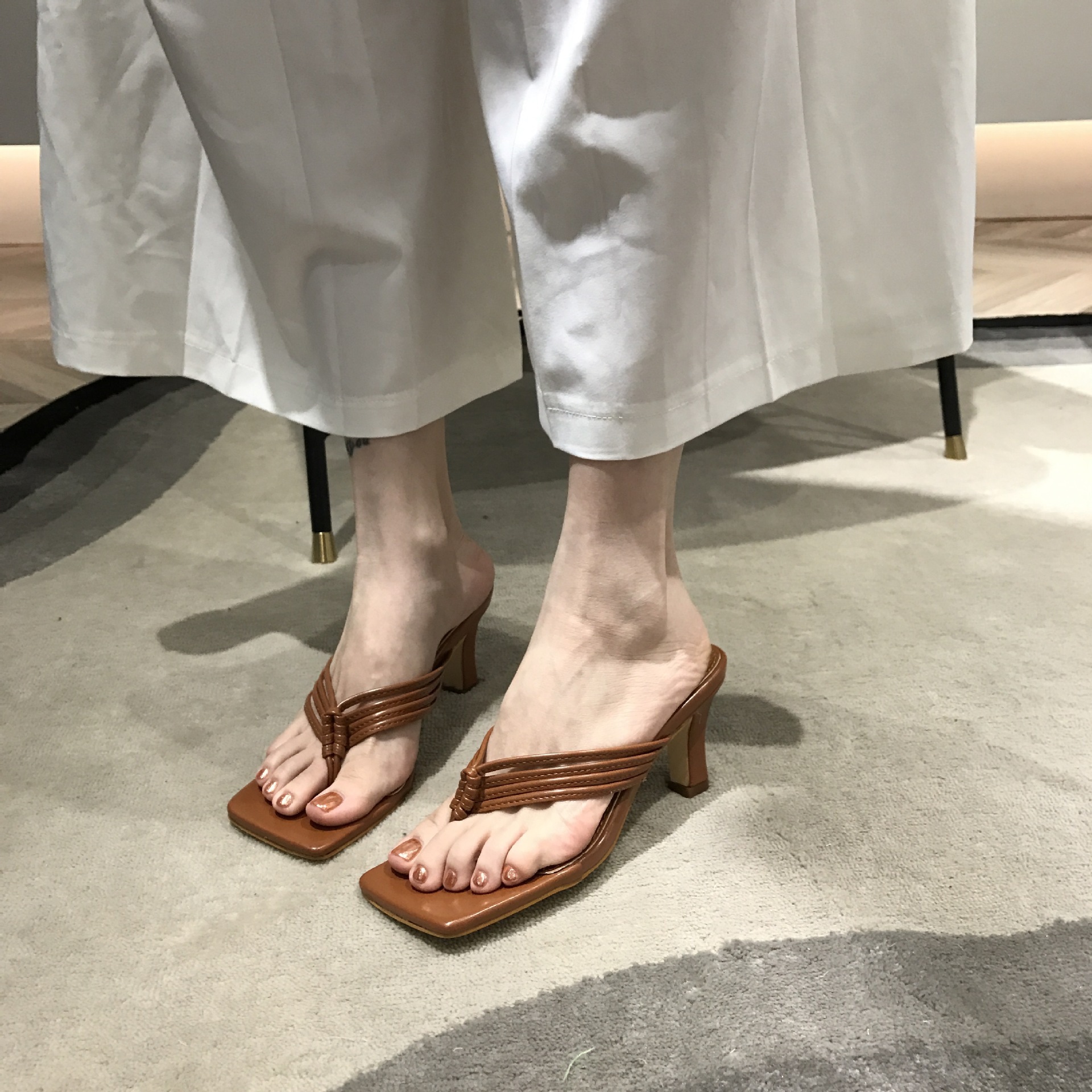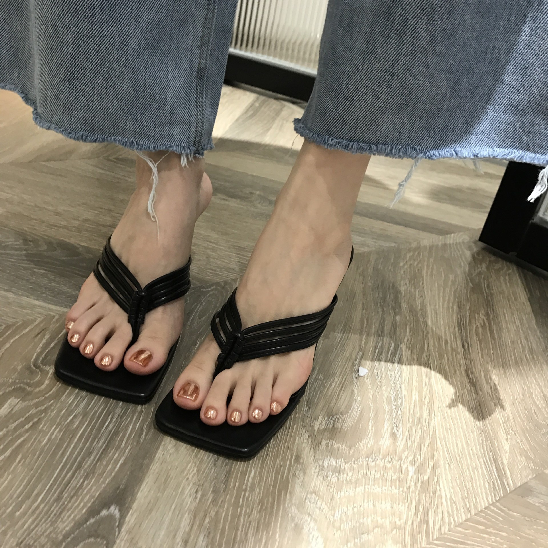 2024 여성용 여름 하이힐 외부 슬리퍼 플립 발가락 짠 비치 스타일 게으른 슬리퍼 두꺼운 힐