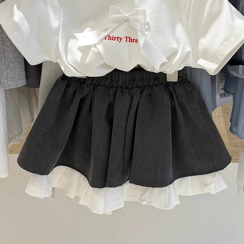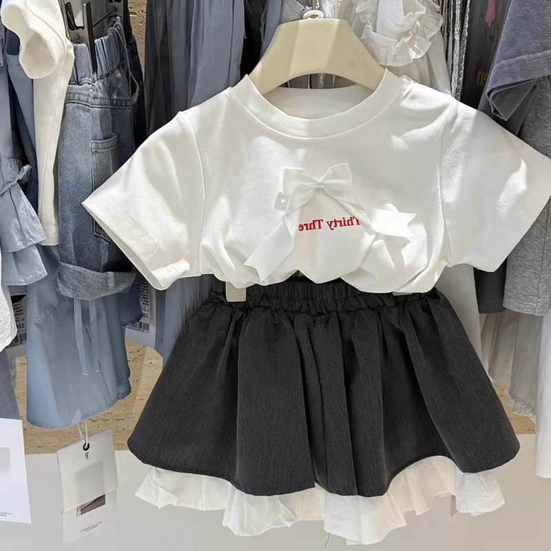 한국 아동복 소녀의 여름 활 흰색 반팔 티셔츠 유행 올 매치 쇼트 스커트 어린이 세련된 투피스 세트