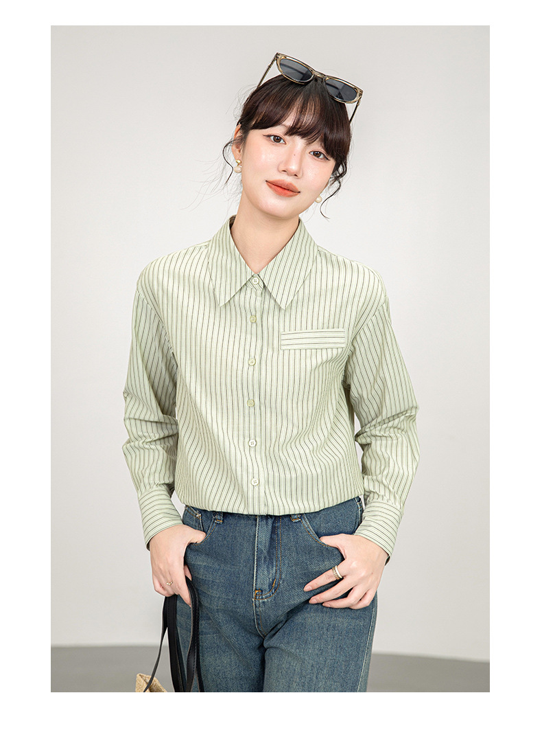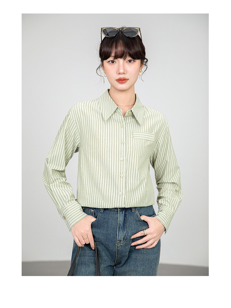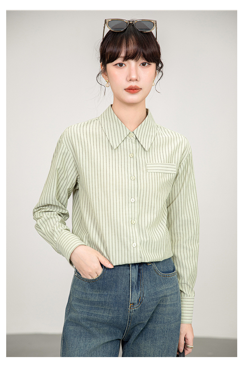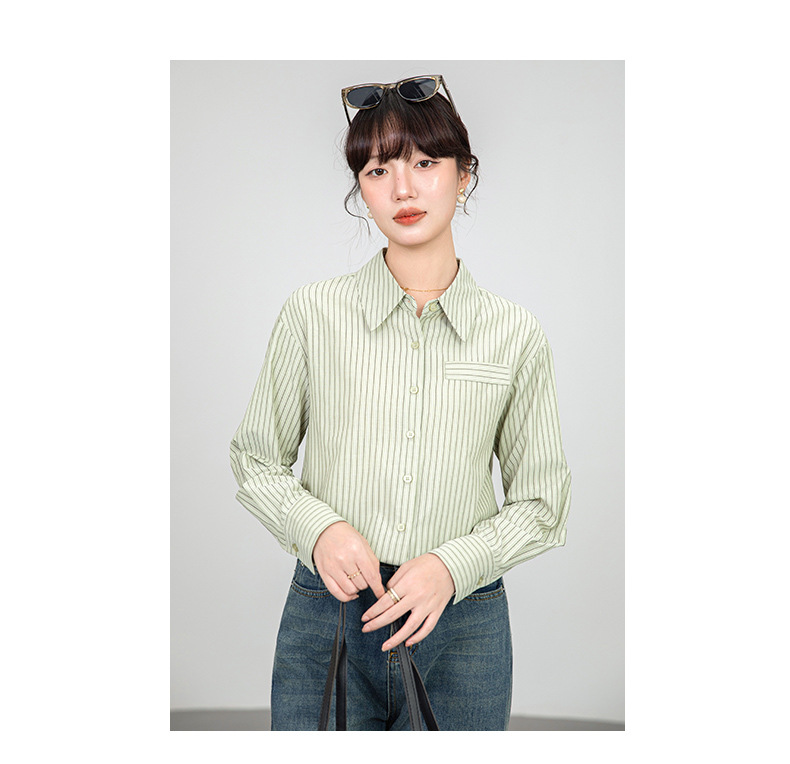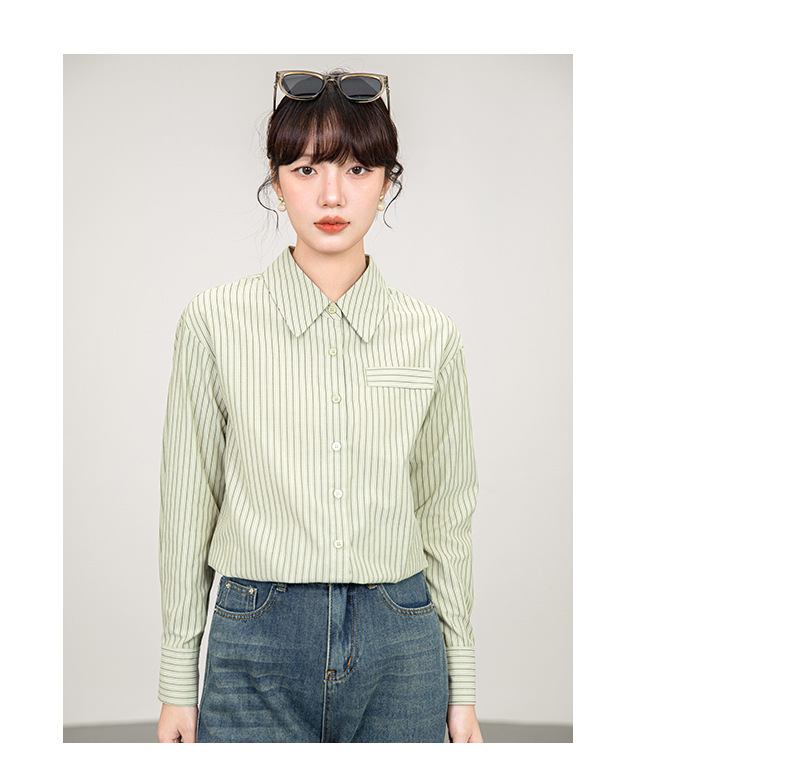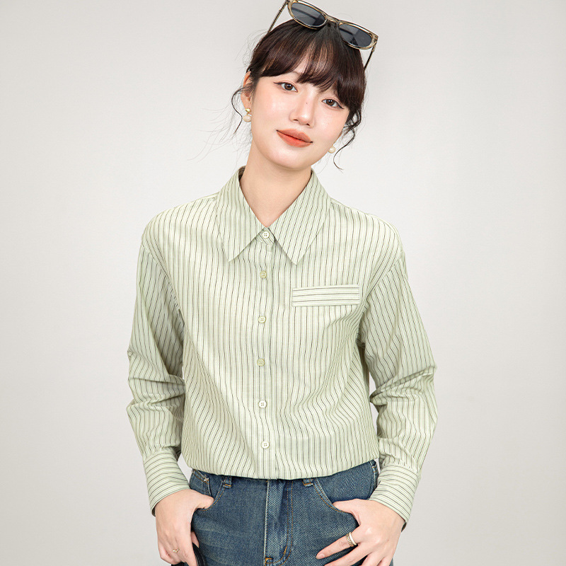 간단한 패션 그린 스트라이프 셔츠 여성의 봄과 가을 새로운 내부 탑 통근 올 매치 우아한 셔츠 재킷 트렌디스토어 가기