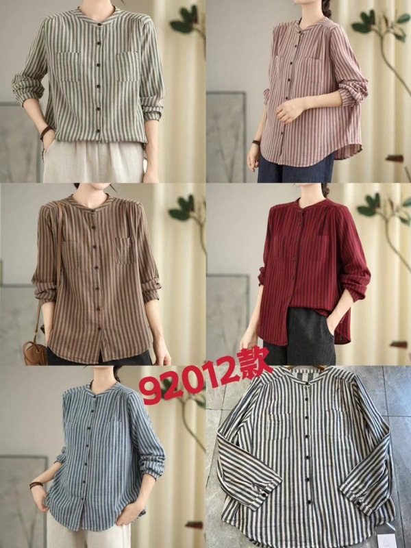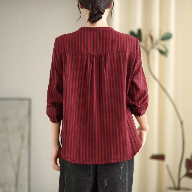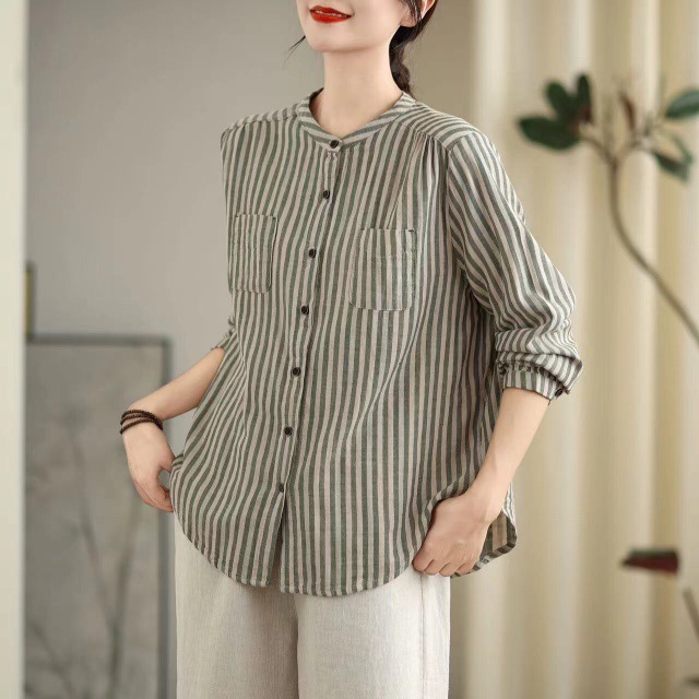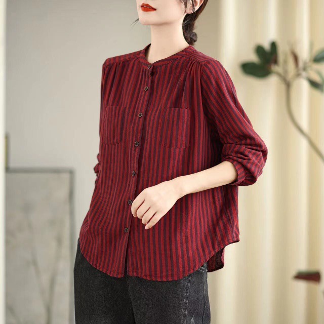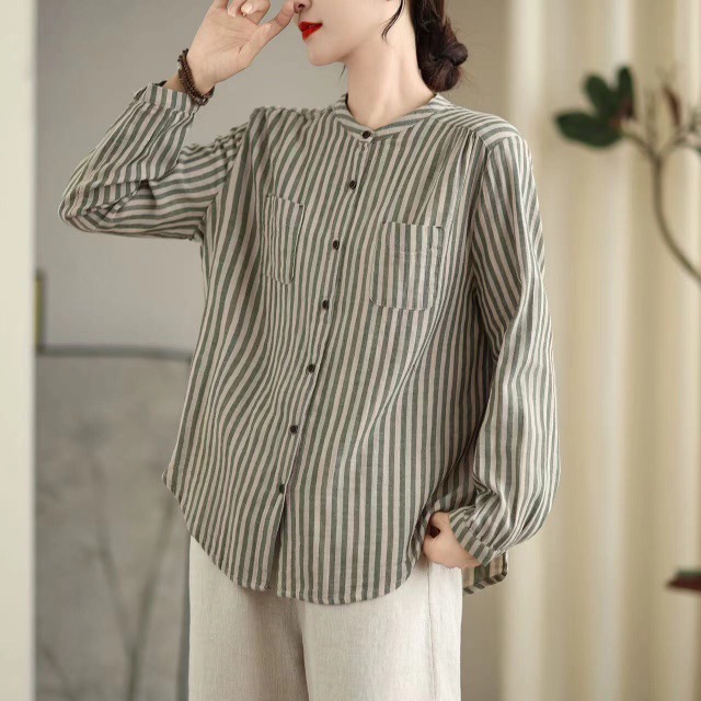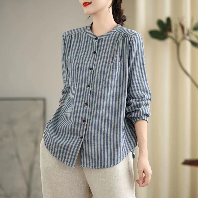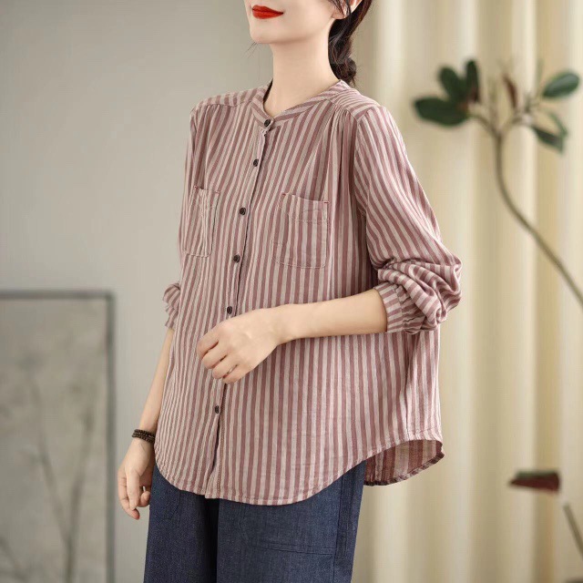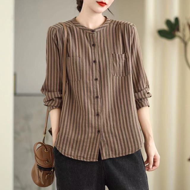 2025 봄 새로운 도착 줄무늬 긴팔 셔츠 예술적 복고풍 간단한 라운드 넥 싱글 브레스트 올 매치 탑