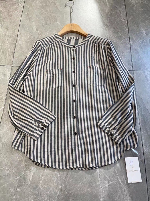 2025 봄 새로운 도착 줄무늬 긴팔 셔츠 예술적 복고풍 간단한 라운드 넥 싱글 브레스트 올 매치 탑스토어 가기