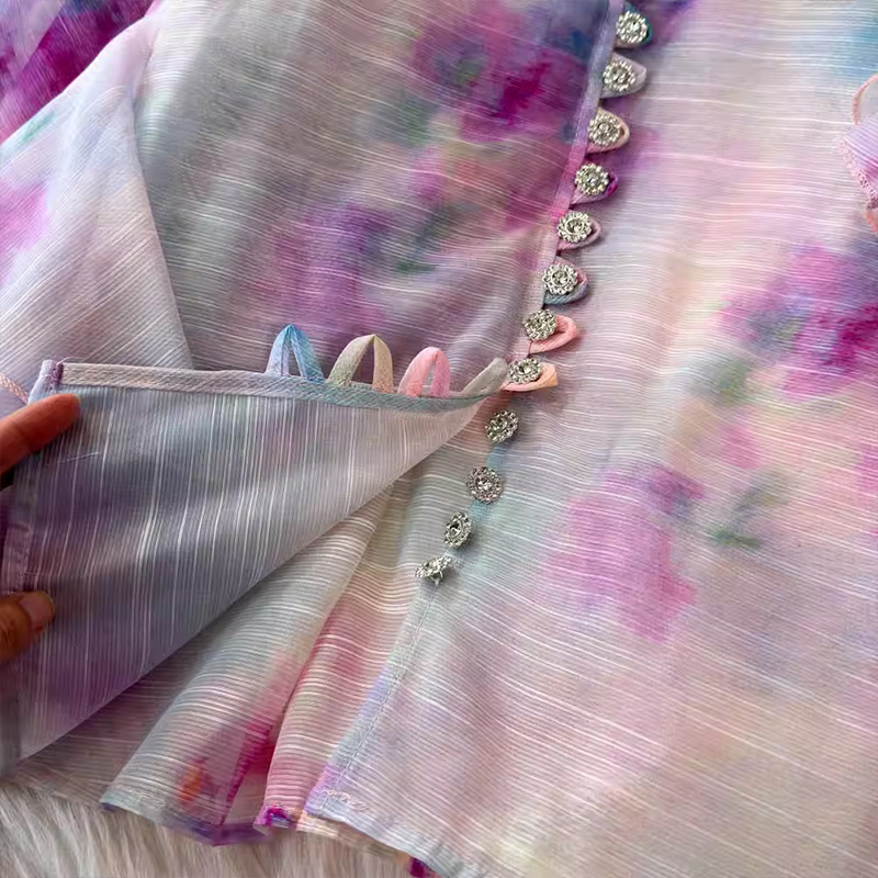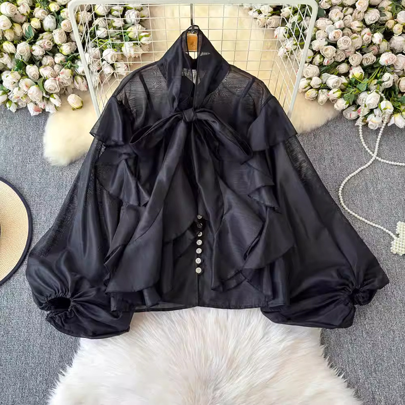 디자인 센스 러플 쉬폰 셔츠 여성용 여름 새 스타일 랜턴 슬리브 레이스 업 슬리밍 타이 염료 내부 슬링 탑