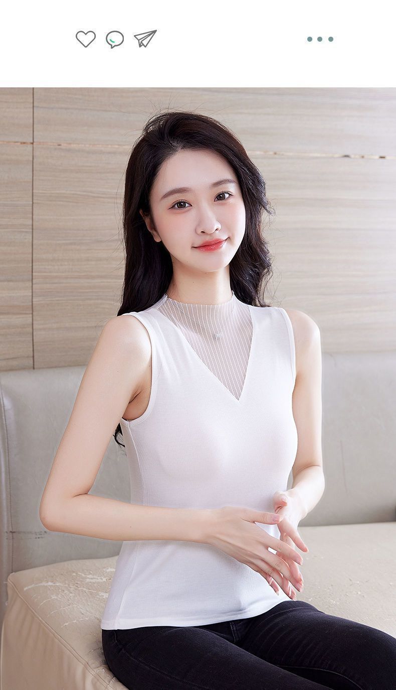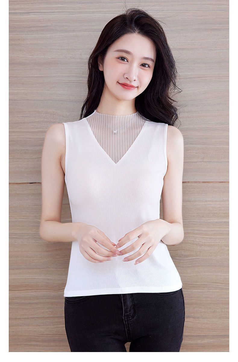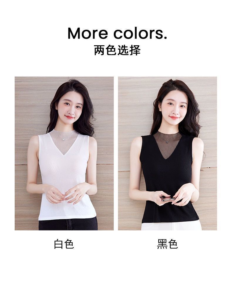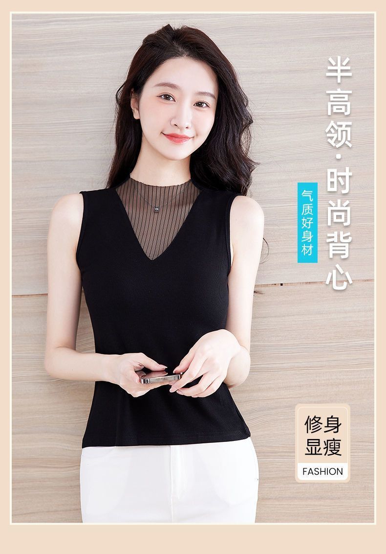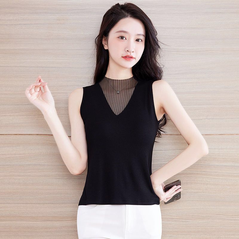 메쉬 V 넥 조끼 여성의 봄과 여름 2024 새로운 스타일 섹시한 Bottoming 외부 착용 슬리밍 블랙 민소매 탑 트렌디