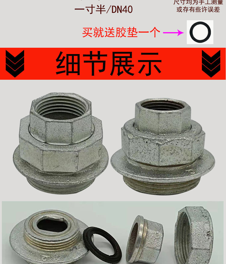 • 실 DN40은 1.2inch개의 연성 강철 부품 유니온으로 변경되며 검정색 고무 패드가 함께 제공됩니다.