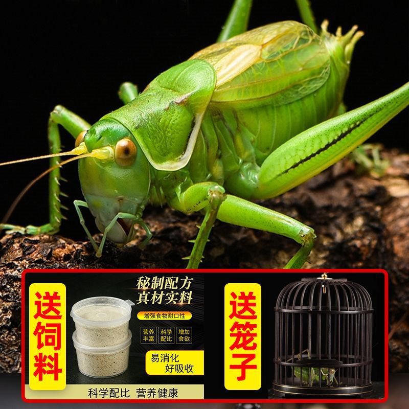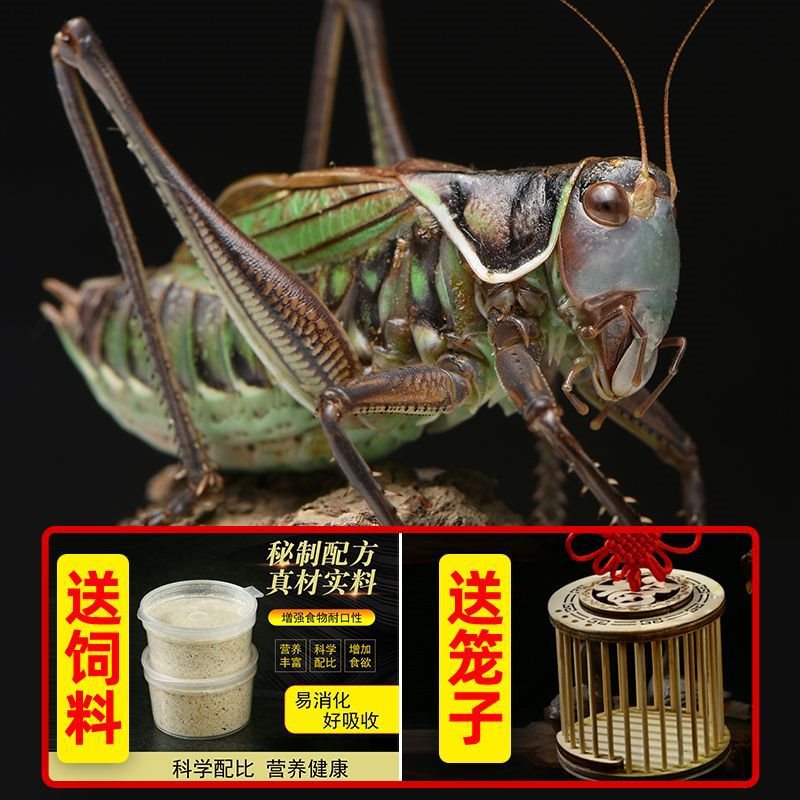 • 대형 녹색 메뚜기 1마리, 조각된 나무 케이지 + 사료 상자 2개