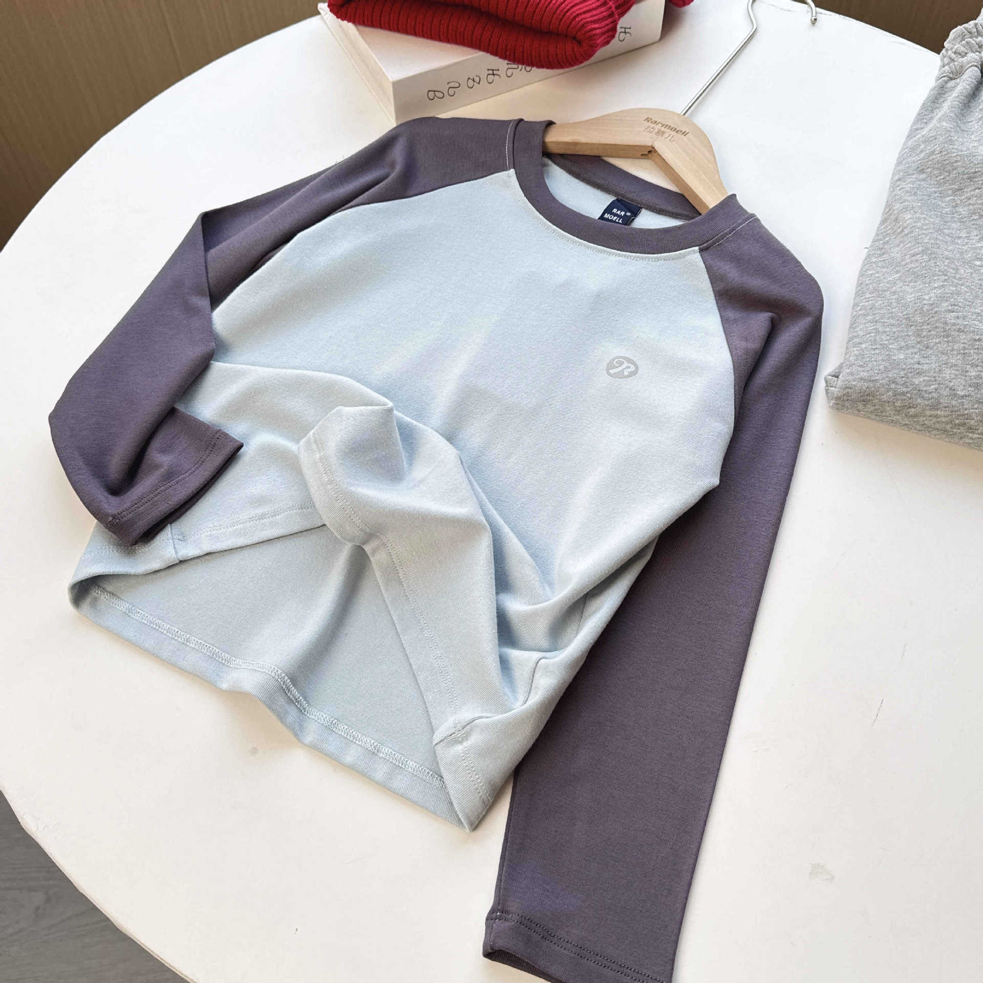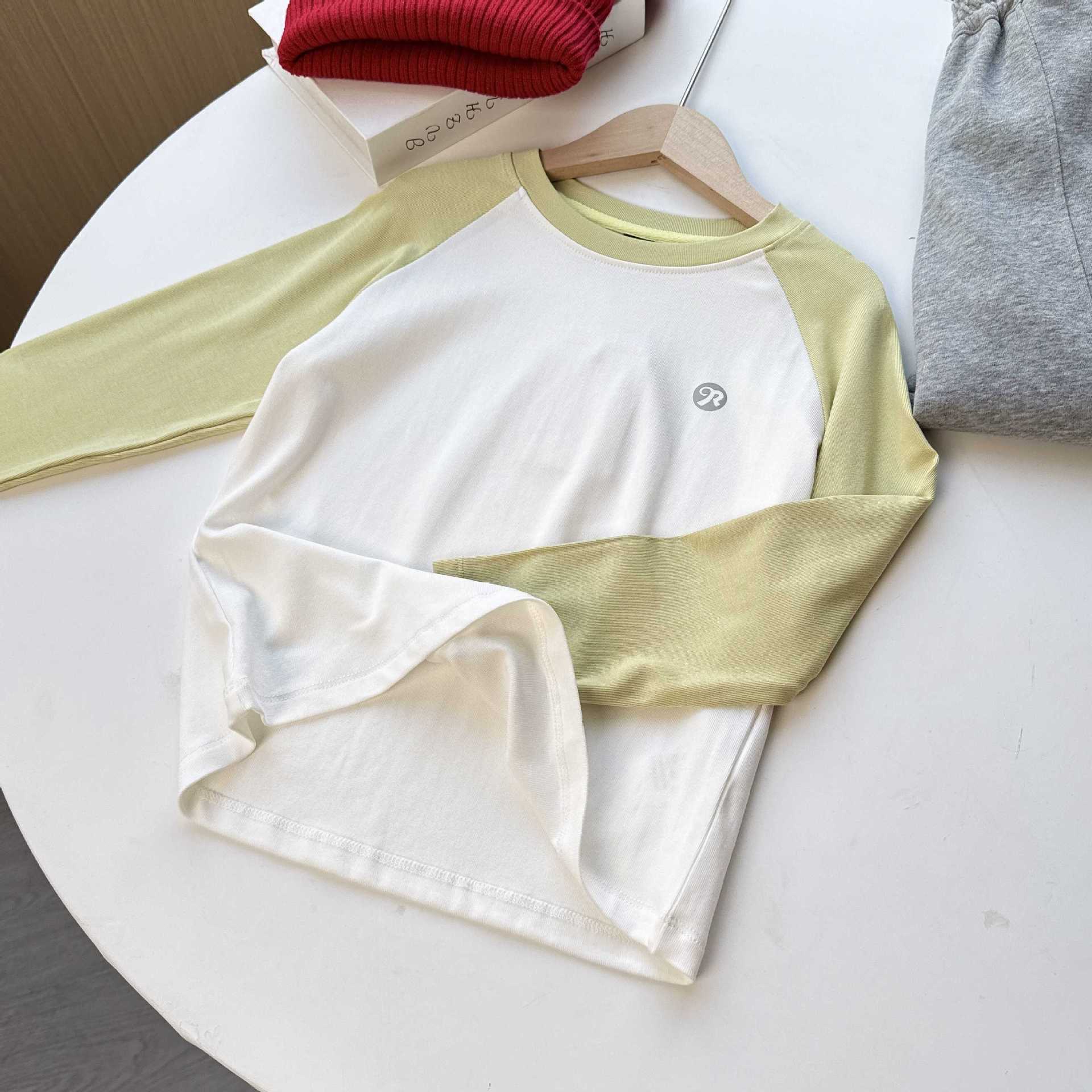 가을 아동용 얇은 신축성 있는 베이스 레이어 셔츠, 남아 및 여아용 라운드 넥 긴팔 셔츠, 단독으로 입는 라글란 슬리브 티셔츠스토어 가기