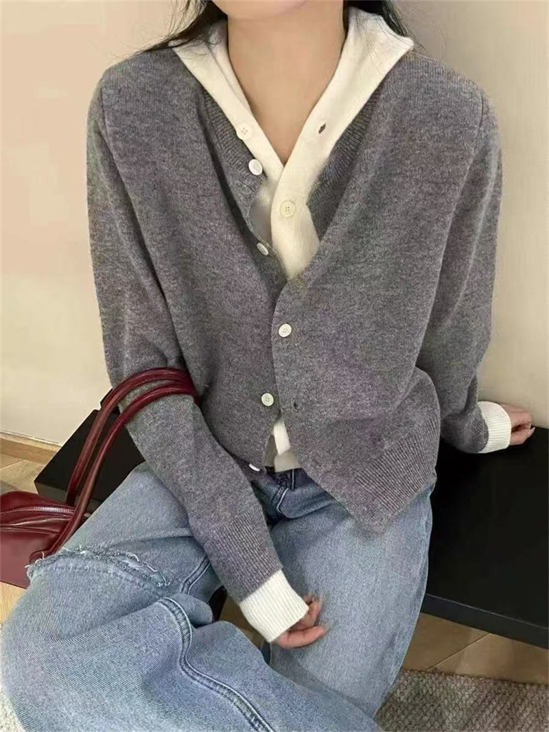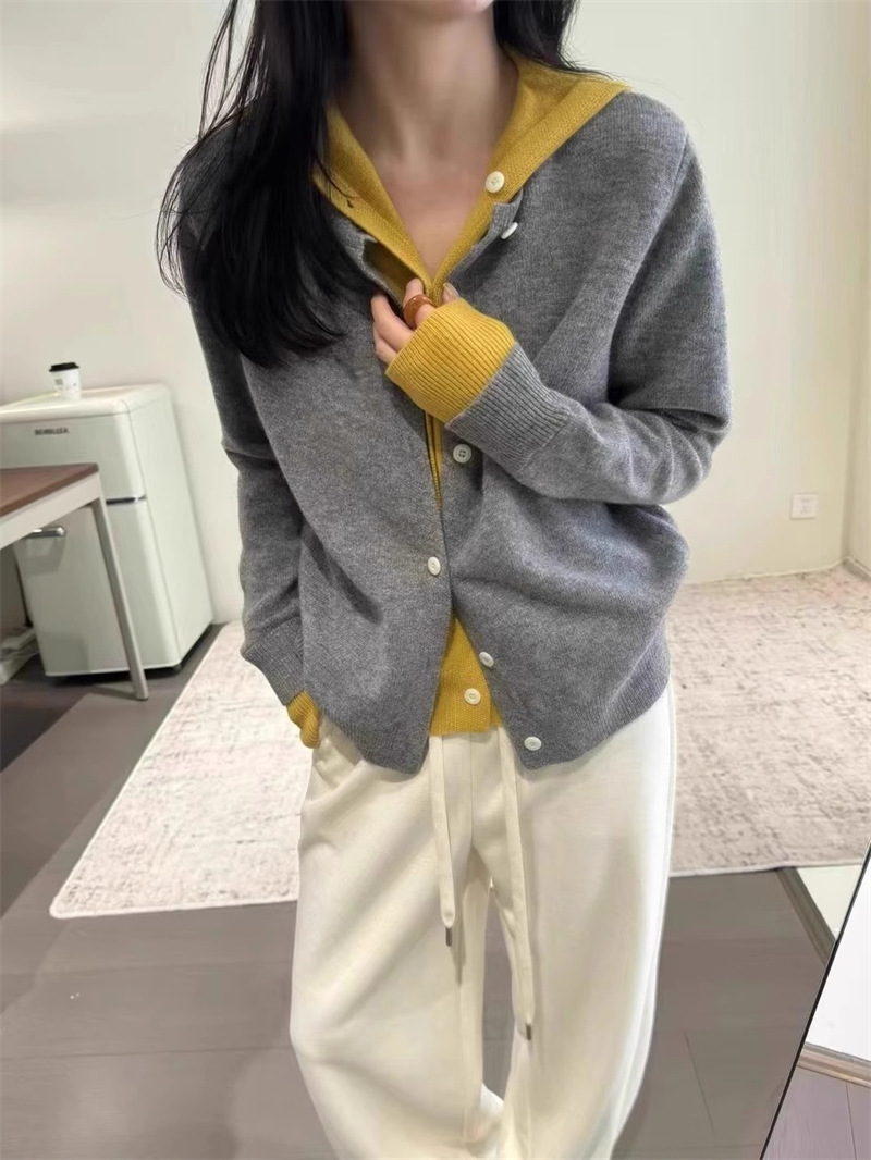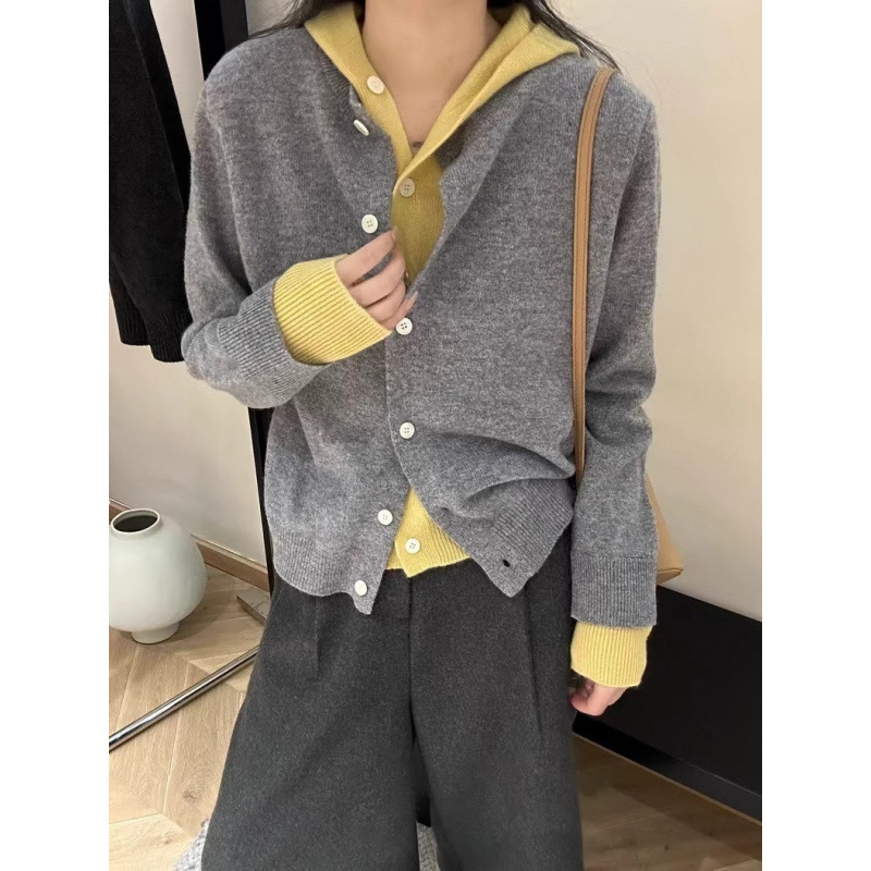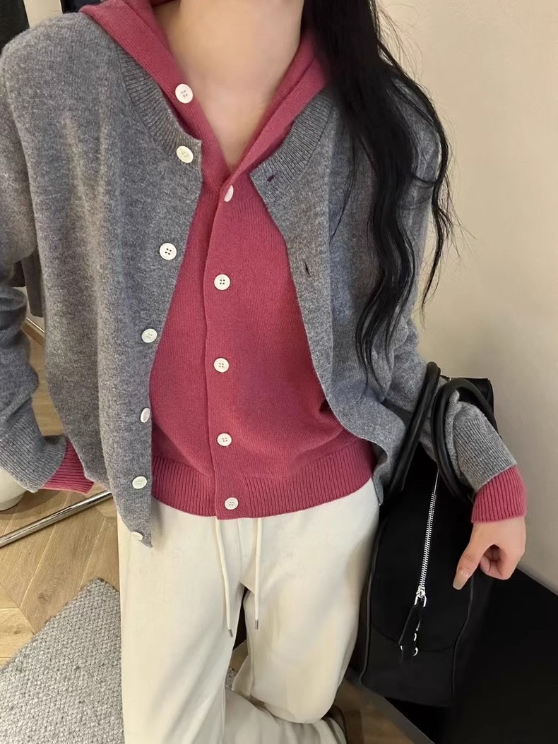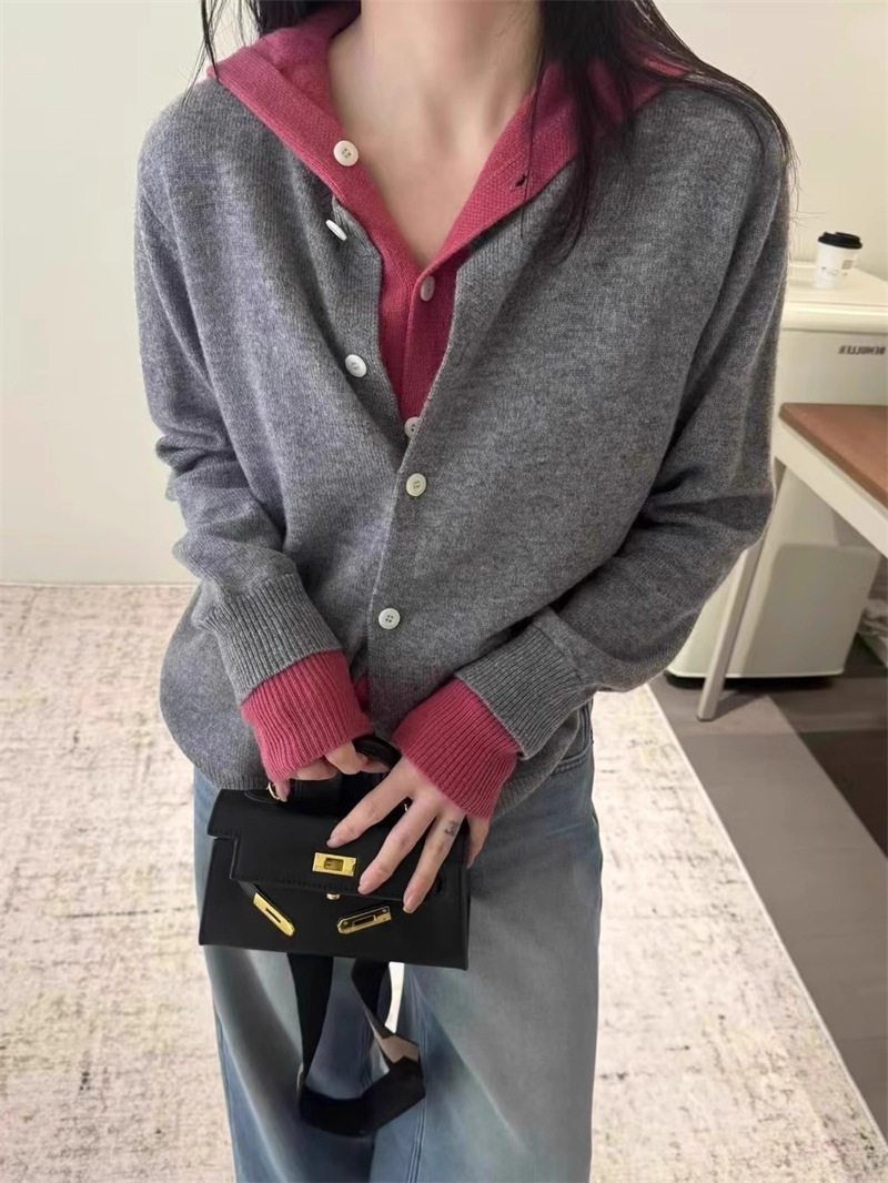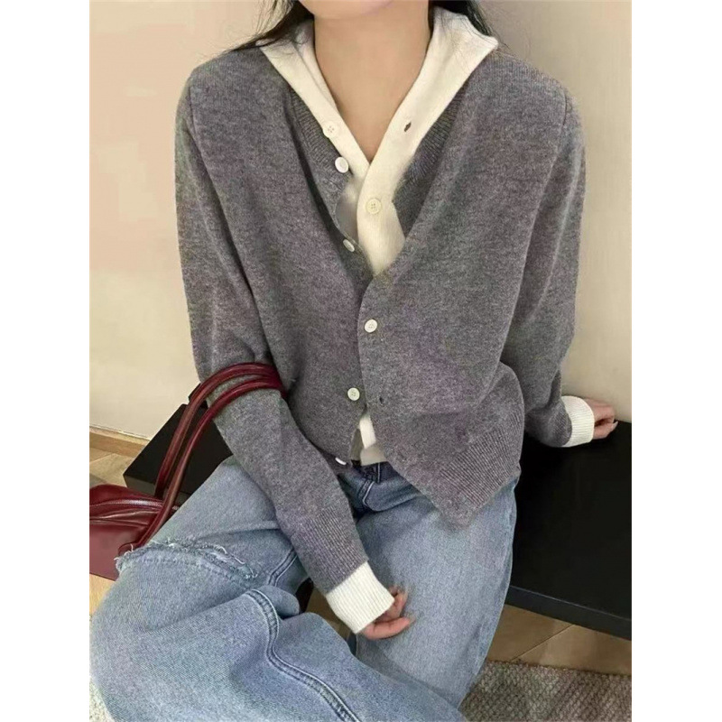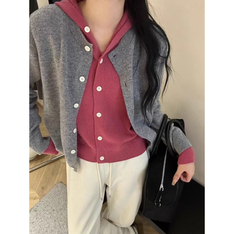 한국 스타일 가짜 투피스 컬러 매칭 후드 니트 카디건 여자 2025 봄 뉴 루즈 캐주얼 올 매치 스웨터 재킷