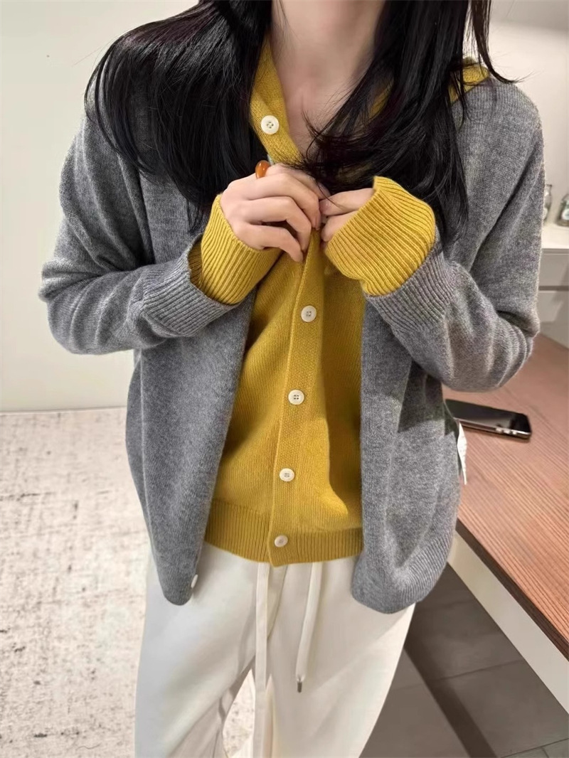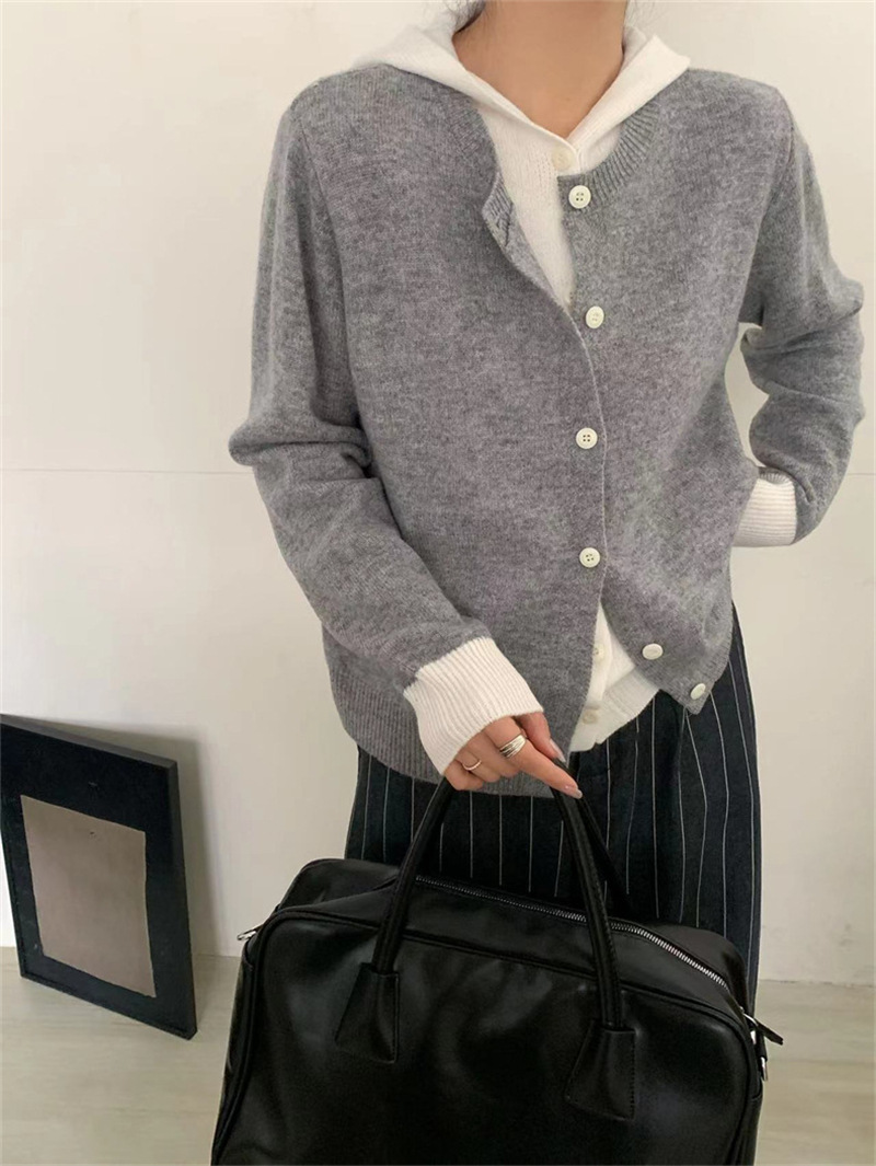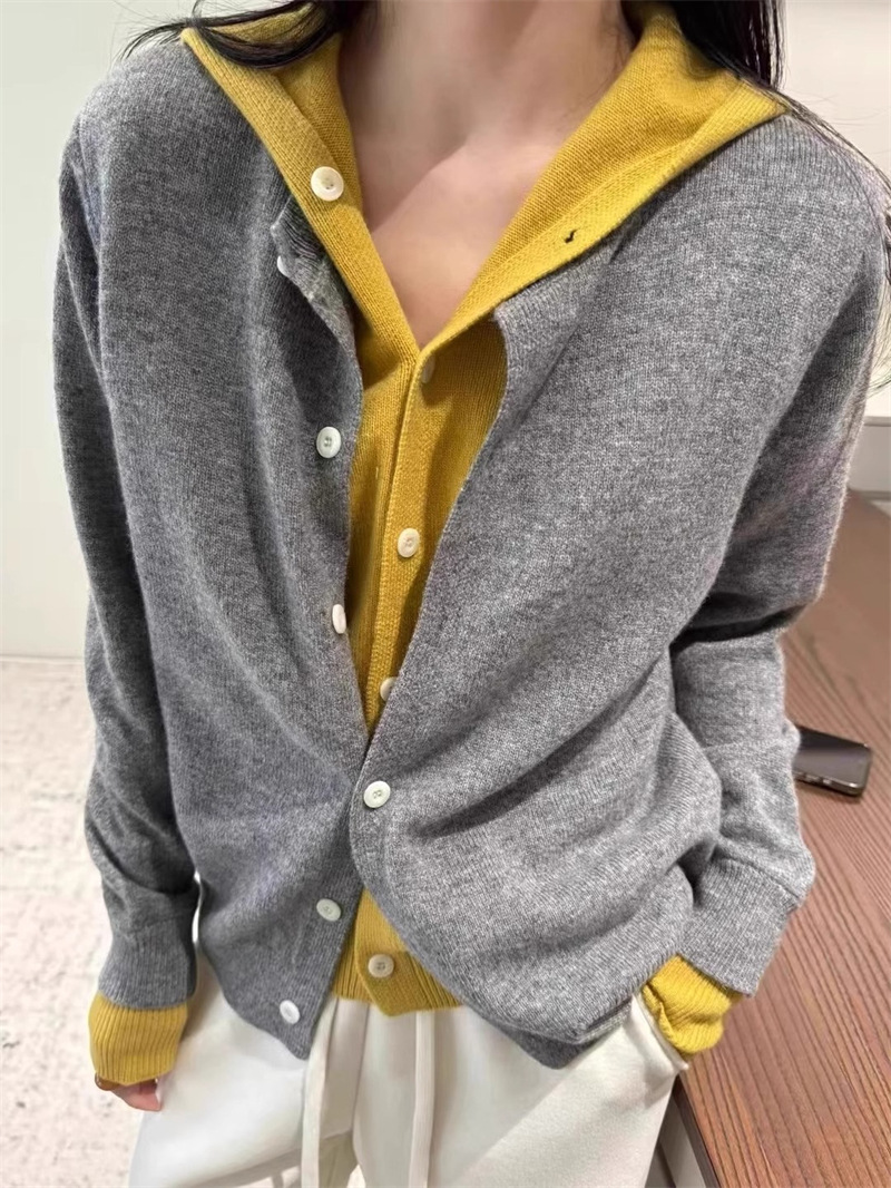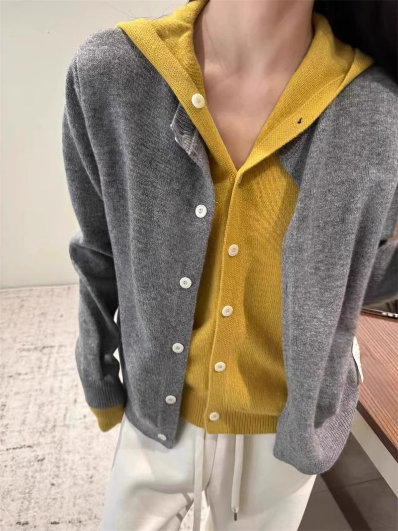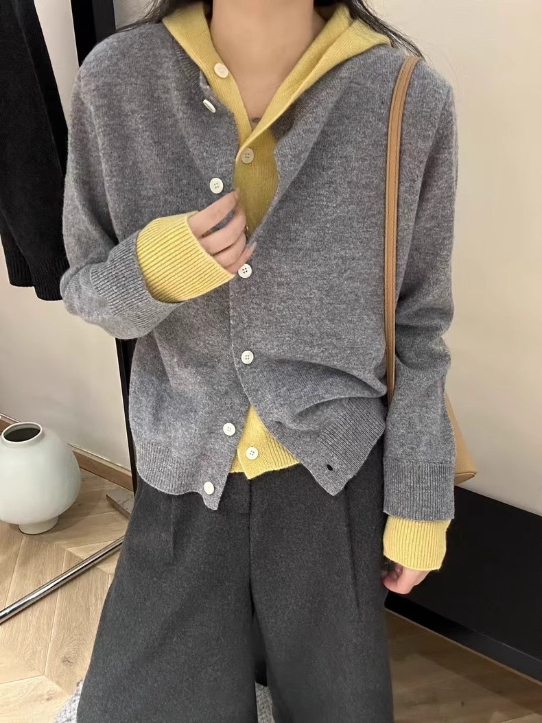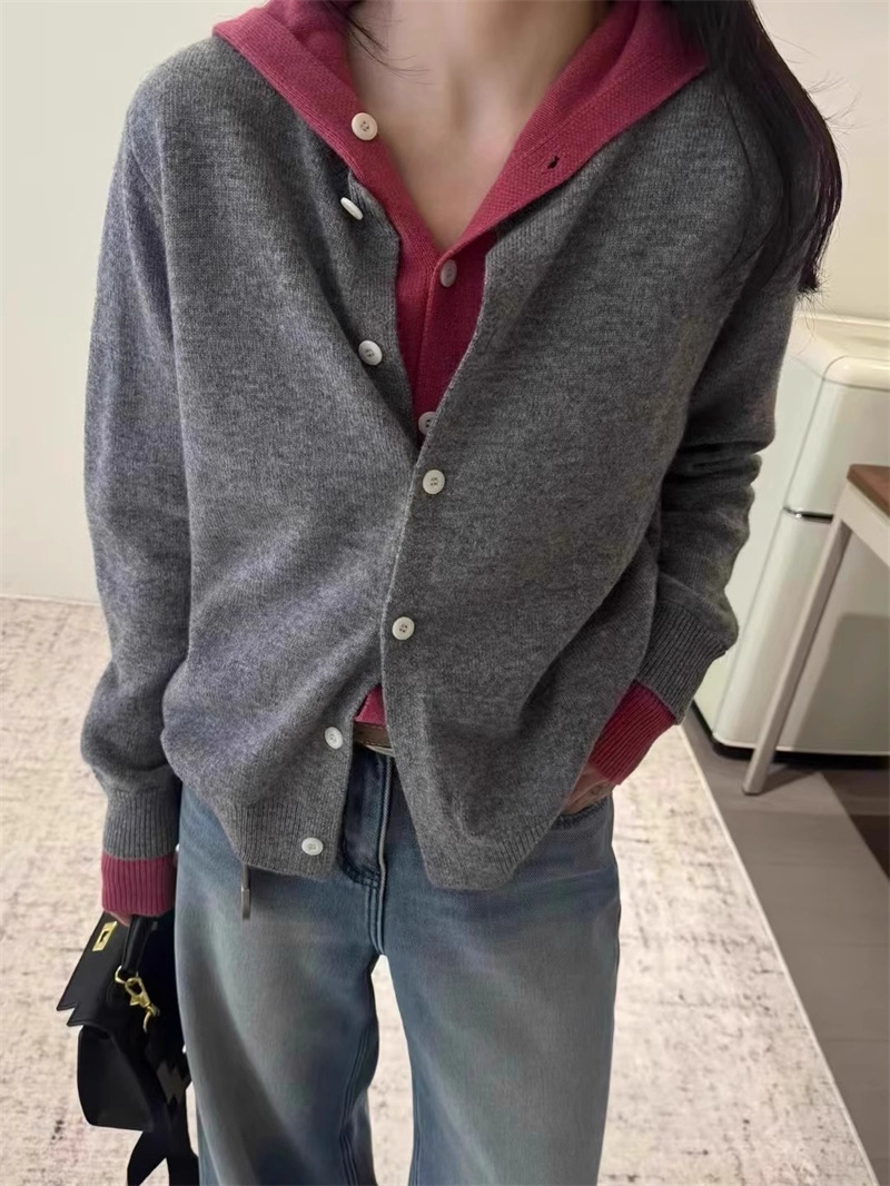 한국 스타일 가짜 투피스 컬러 매칭 후드 니트 카디건 여자 2025 봄 뉴 루즈 캐주얼 올 매치 스웨터 재킷