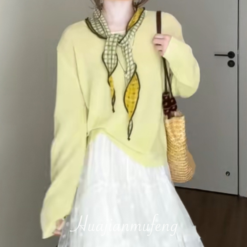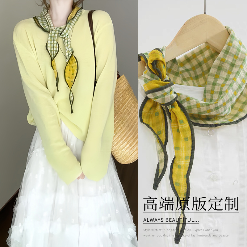 一款双色!早春草绿黄格纹丝巾女双面三角巾森系棉质领巾脖子配饰