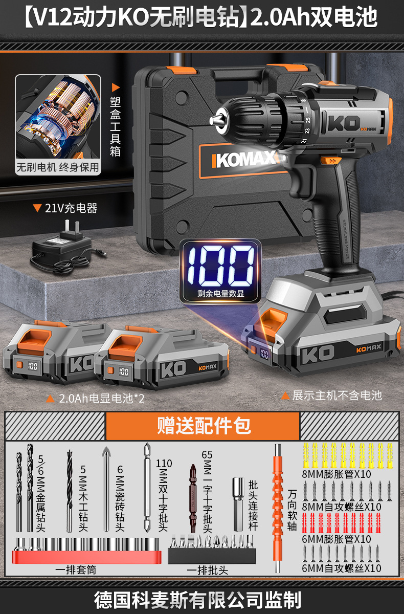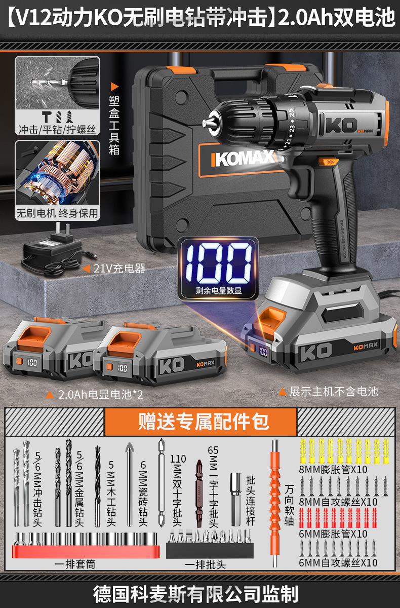 • [임팩트가 있는 V12 파워 KO 브러시리스 드릴] 2.0Ah 듀얼 배터리