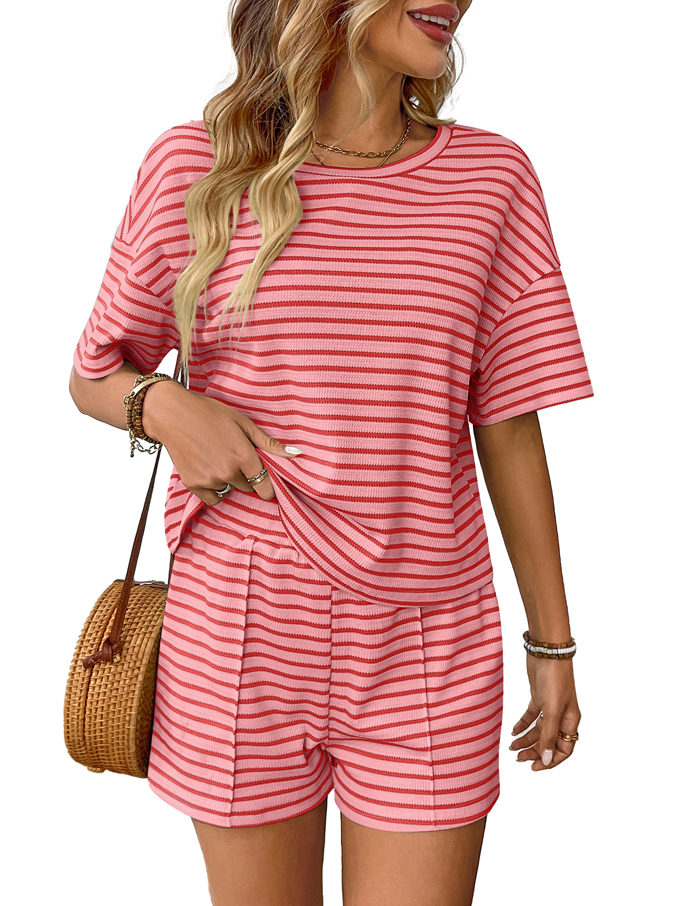 국경을 넘는 유럽과 미국 여성의 2025 년 여름 새로운 아마존 니트 스트라이프 패션 캐주얼 반바지 스포츠 세트 여성