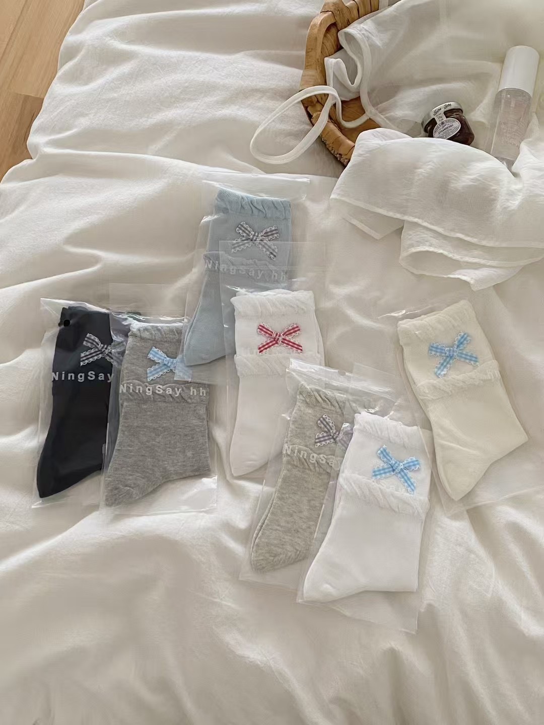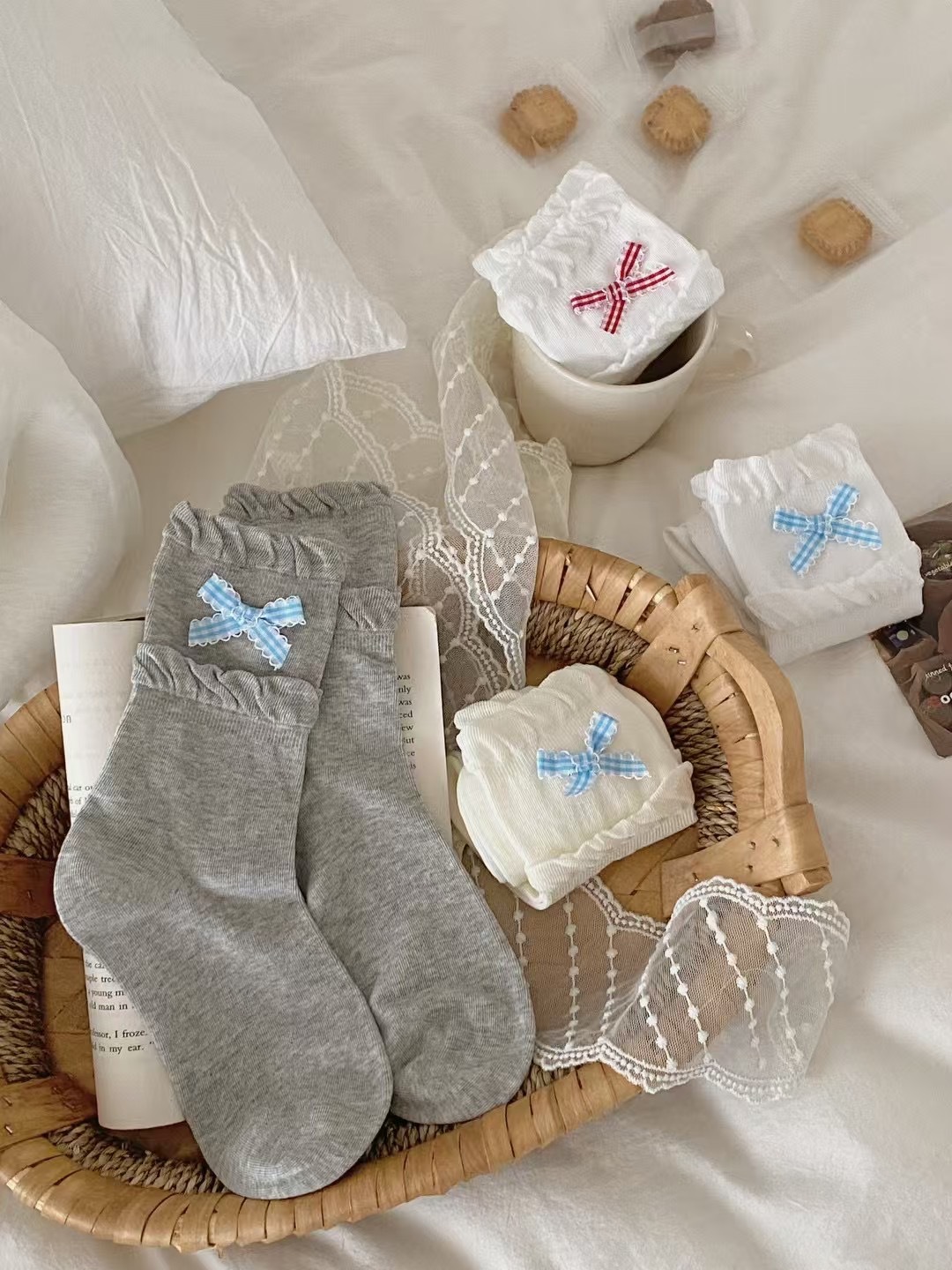 秋冬新品songmu韩国ins灰色丝绒蝴蝶结雪花百搭潮袜棉无骨中筒袜 RMB:4.60