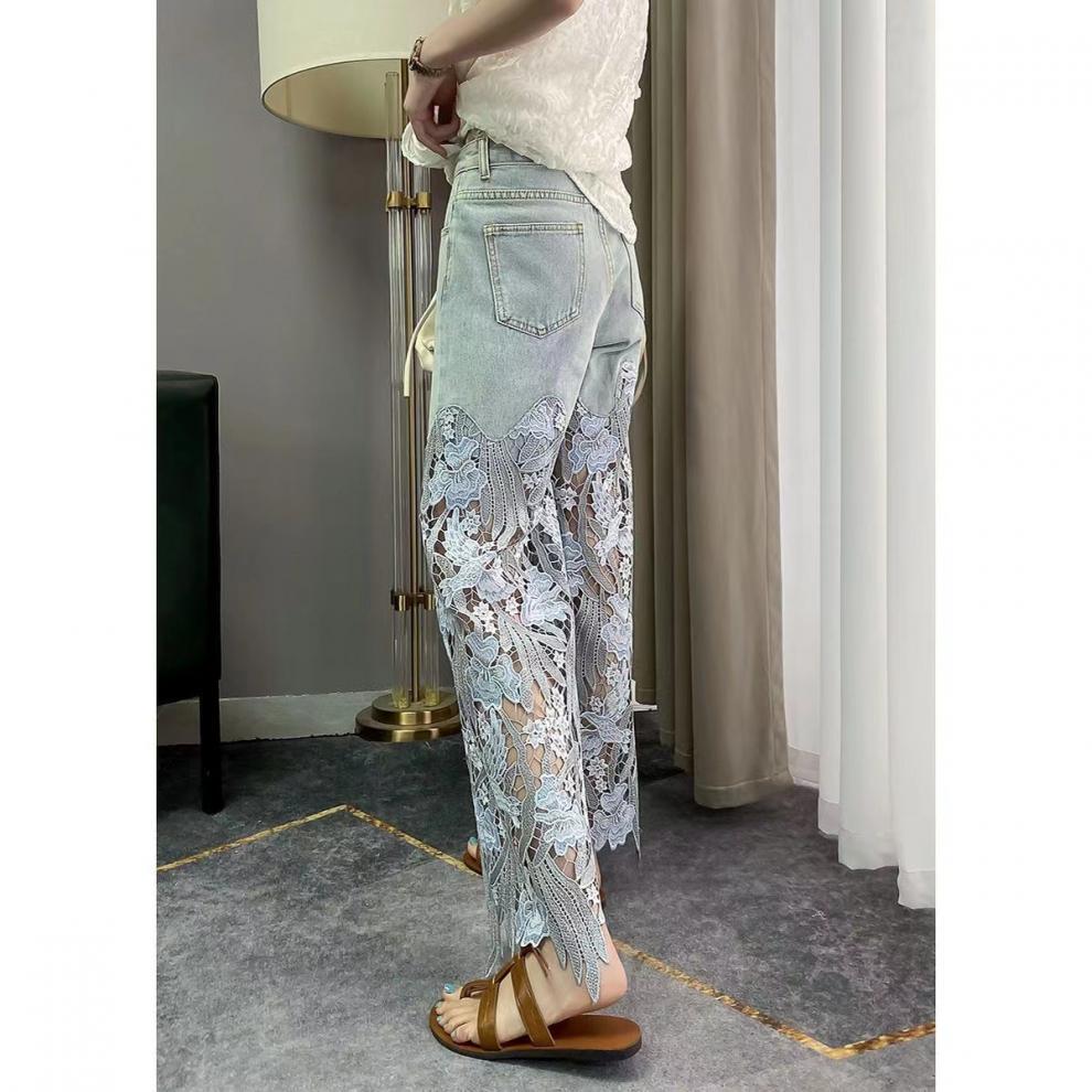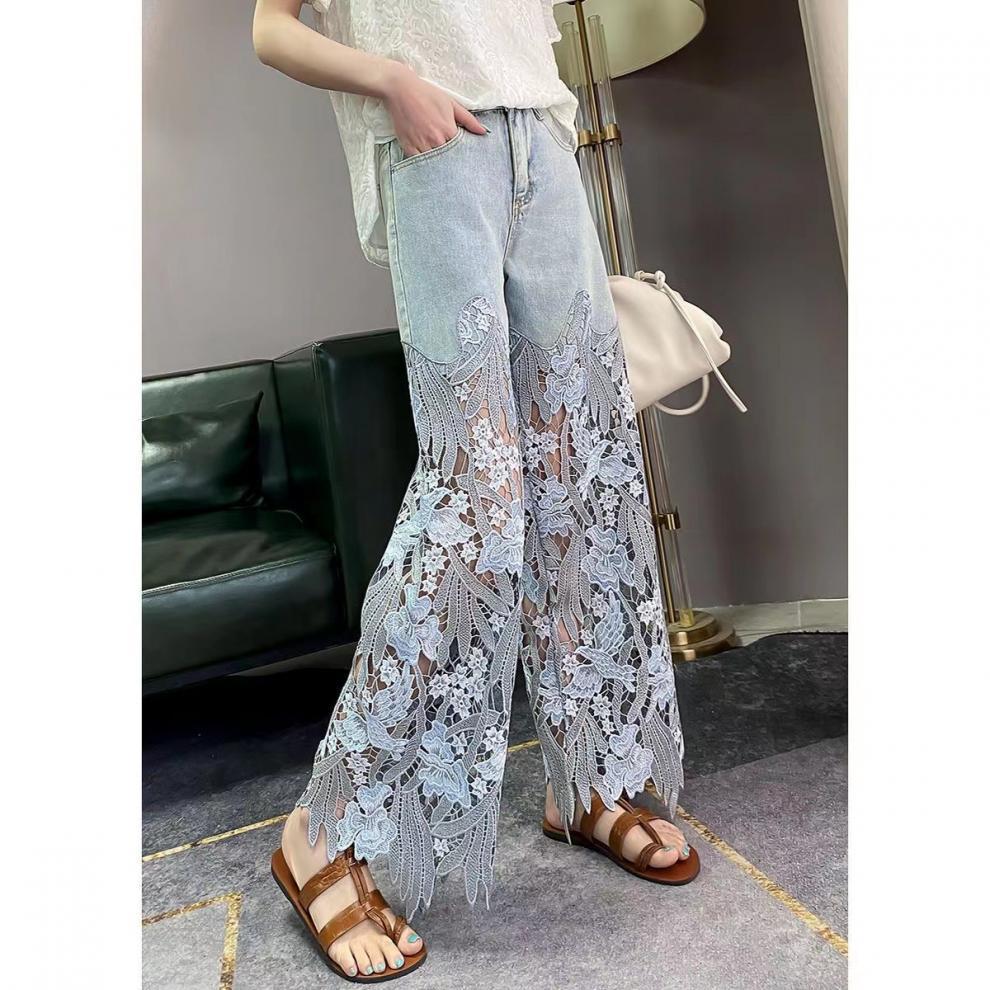 가벼운 럭셔리 할로우 레이스 바느질 넓은 다리 높은 허리 블루 청바지 여성의 여름 새로운 슬림 룩 패션 스트레이트 바지스토어 가기